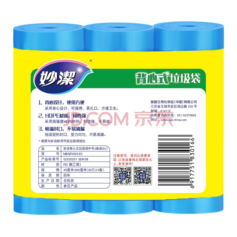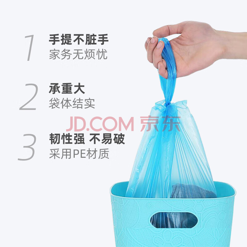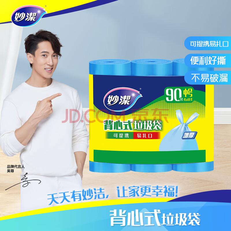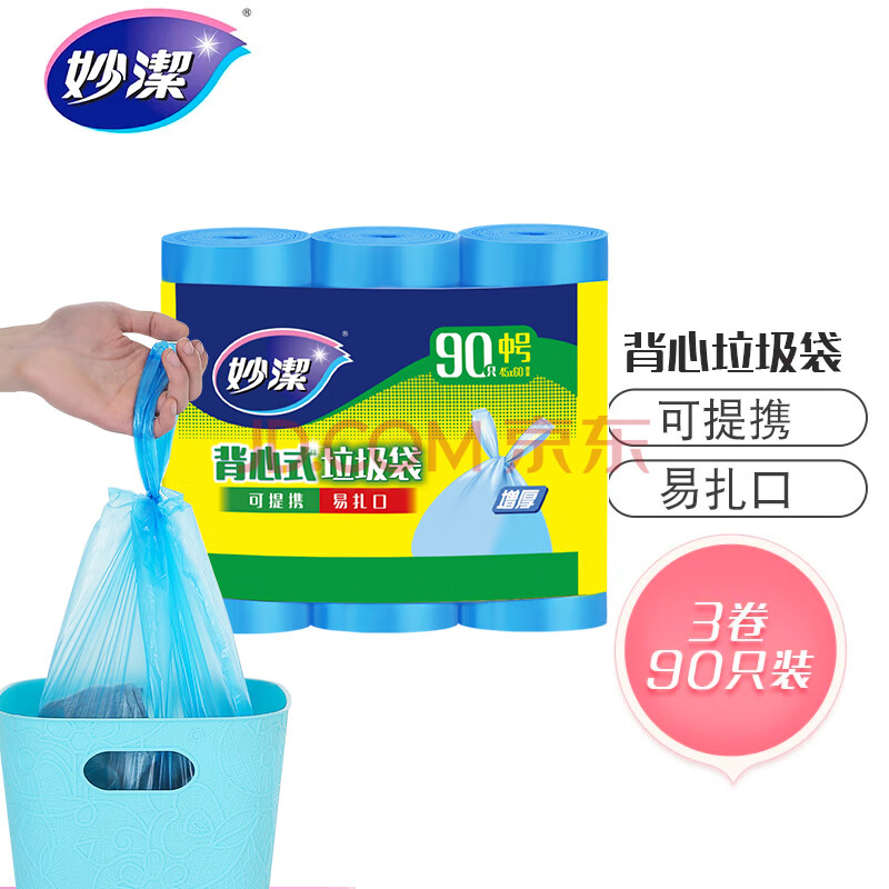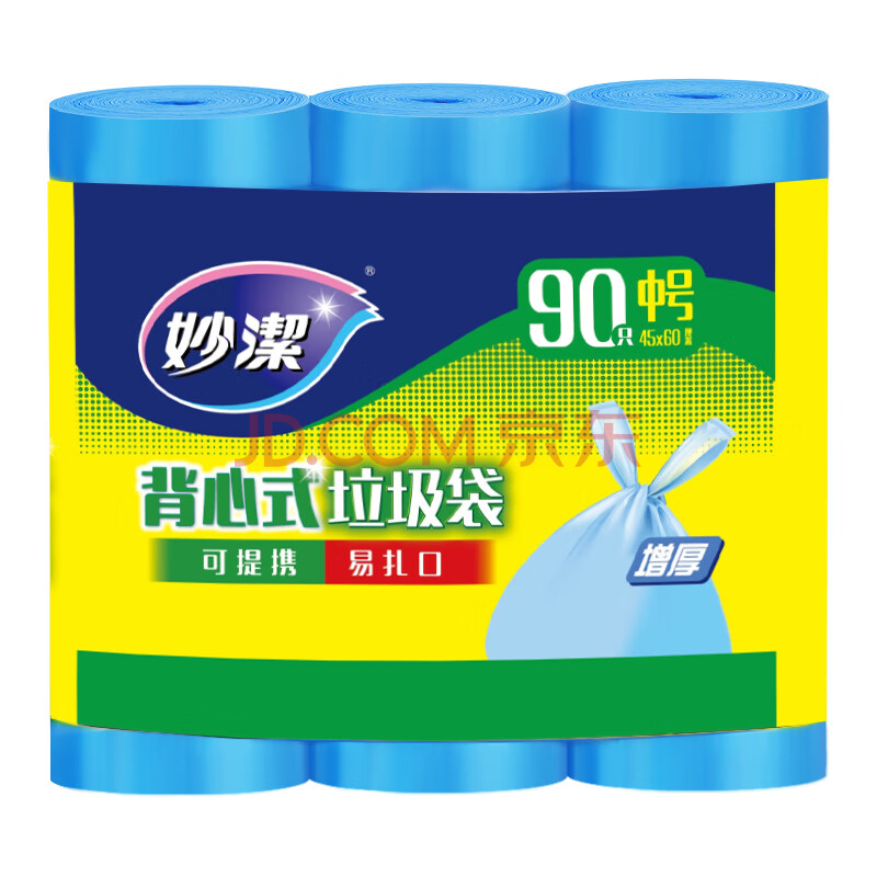 商品相册:妙洁背心垃圾袋蓝色45*60cm90只单面0.8丝点断式中号第