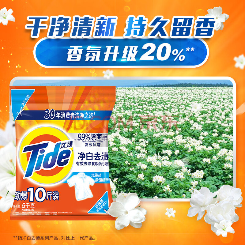 商品相册:汰渍净白去渍洗衣粉10斤装 强效去渍 持久留香 大袋批发非皂粉家庭装第