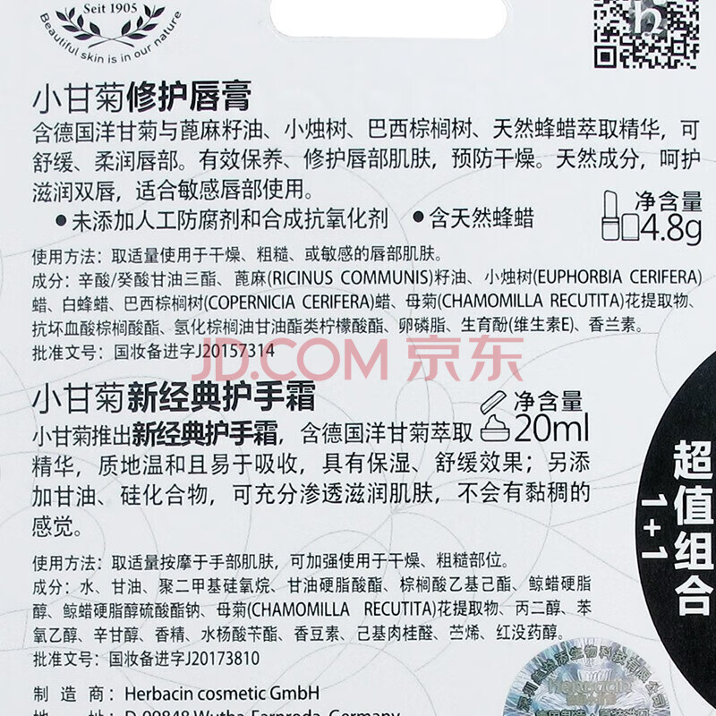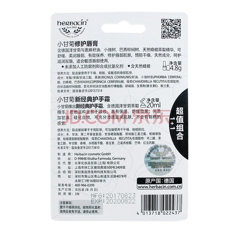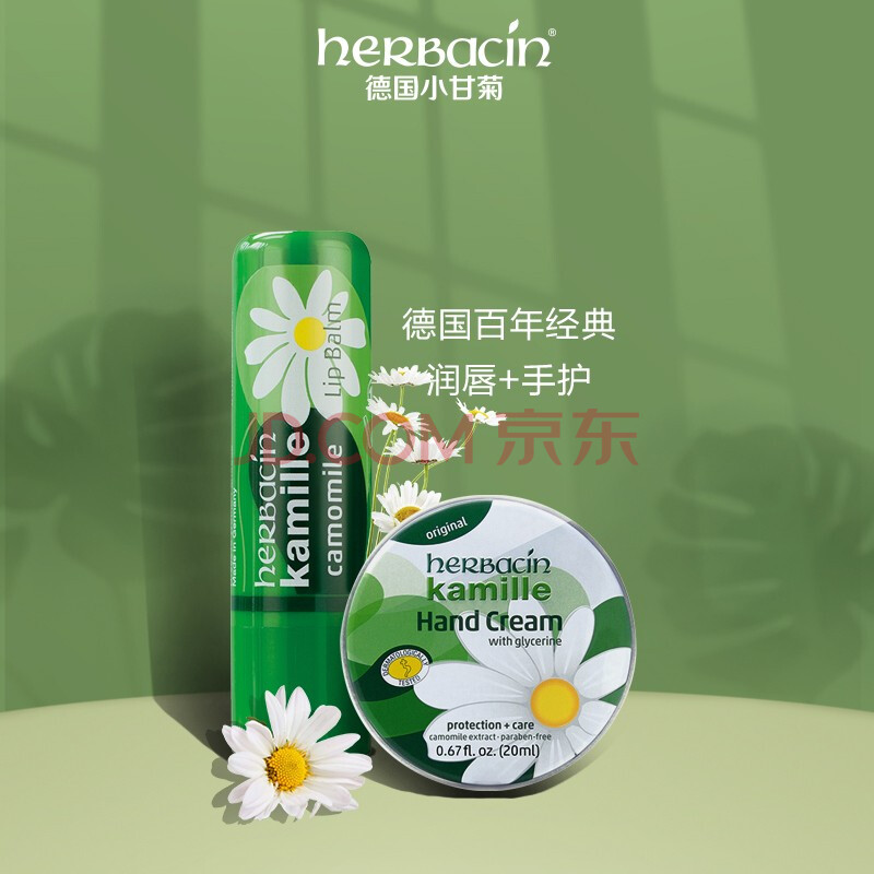 商品相册:Herbacin好本清德国小甘菊手唇套组(唇膏4.8g+手霜20ml )伴手礼礼物送礼第1张/共6