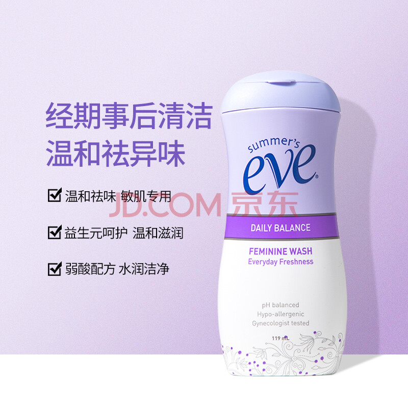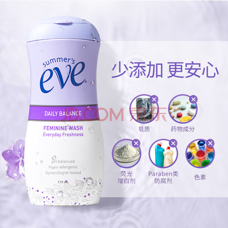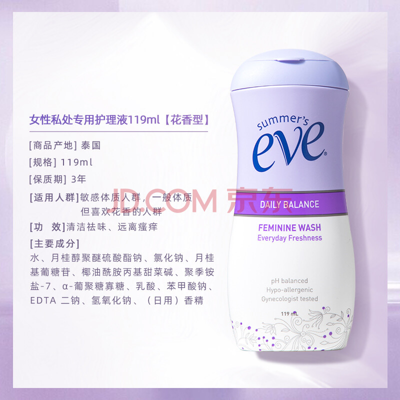 商品相册:夏依eve 女性私密护理液 花香型私处洗液119ml 原装进口弱酸无皂无药第