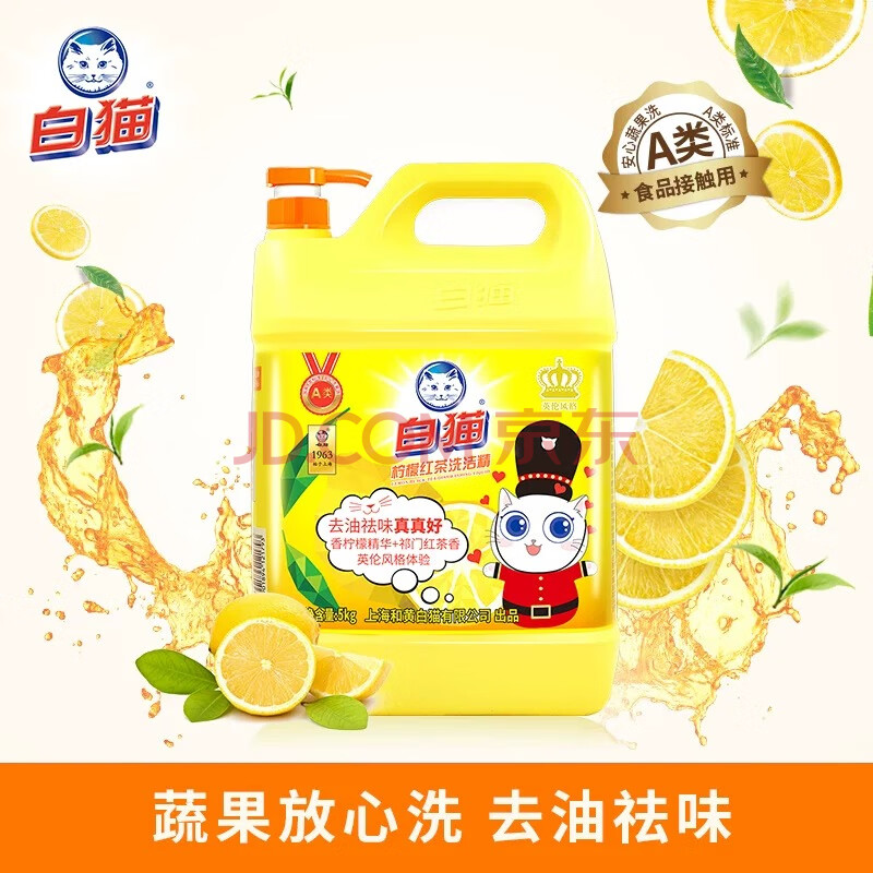 商品相册:白猫 柠檬红茶洗洁精5kg A类去油祛味柠檬红茶香 大桶洗洁精第1张/共7