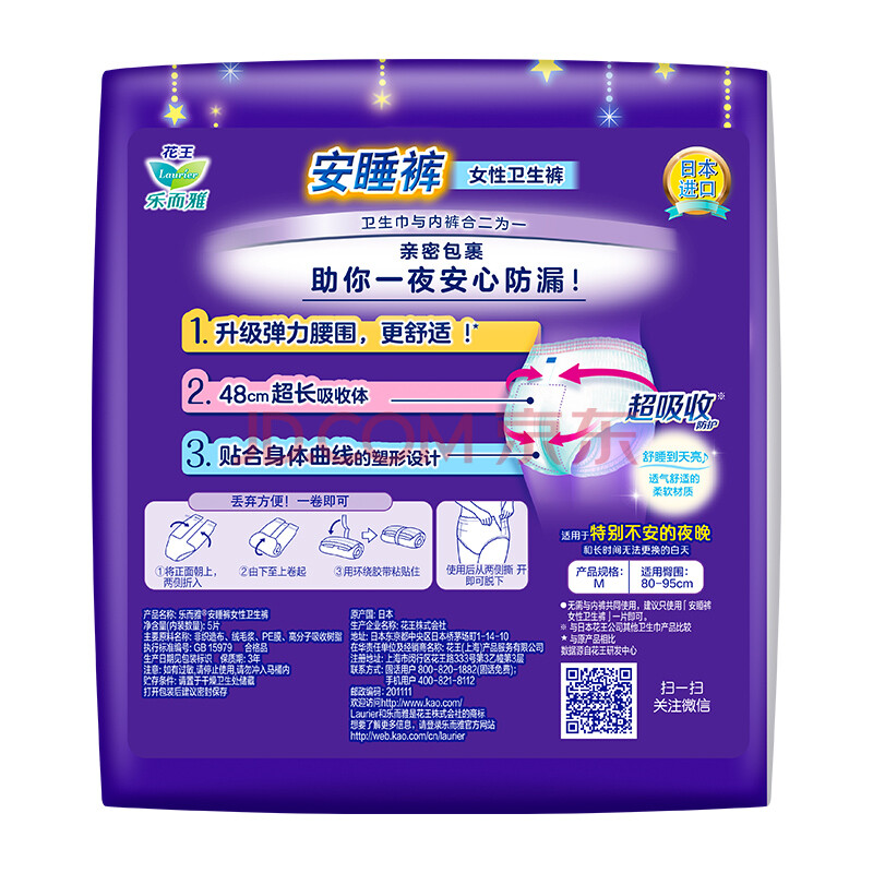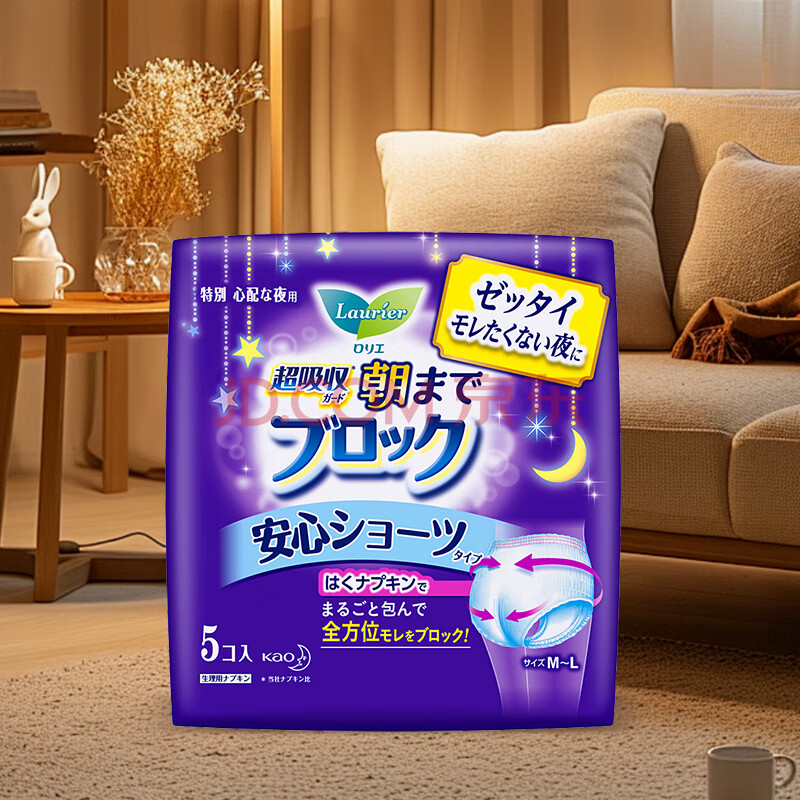商品相册:乐而雅花王进口安睡裤型卫生巾M码5片超长姨妈巾柔软透气夜安裤京东自营第