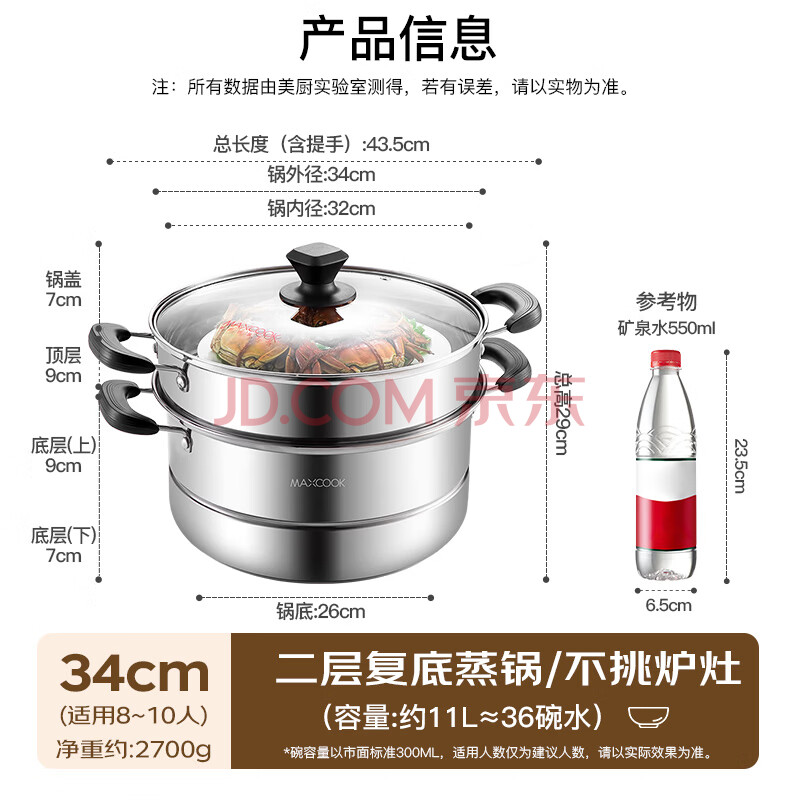 商品相册:美厨(maxcook)二层蒸锅34cm 不锈钢复底蒸锅 燃气灶电磁炉通用 适合2-8人第