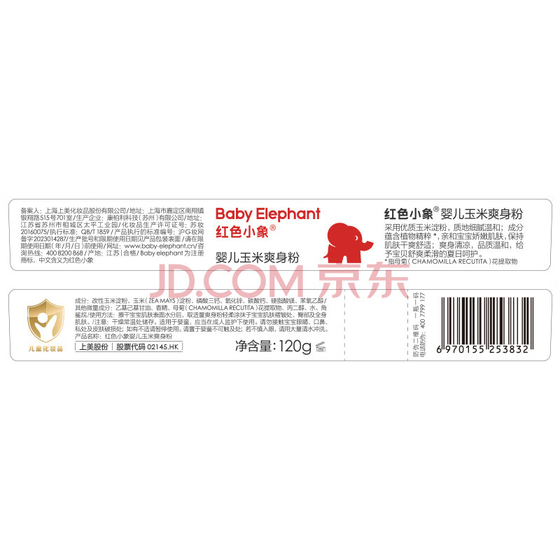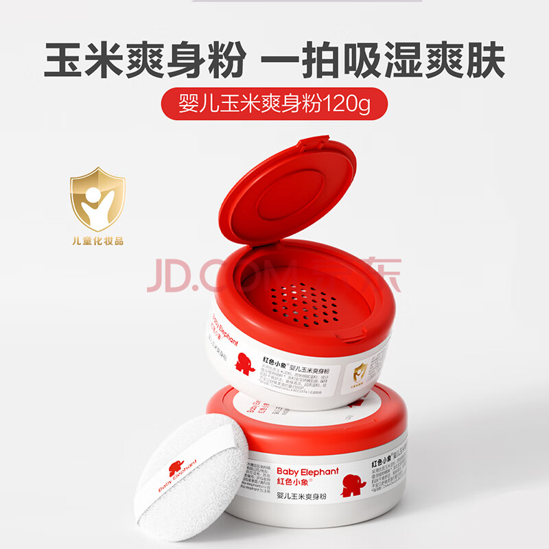 商品相册:红色小象婴儿玉米爽身粉120g 新生儿天然不含滑石粉 痱子粉带粉扑祛热抑菌第