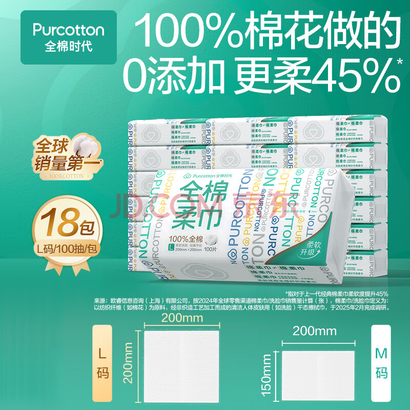 商品相册:全棉时代【孙颖莎同款】洗脸巾 100抽*18包100%棉柔巾一次性整箱20*20CM第