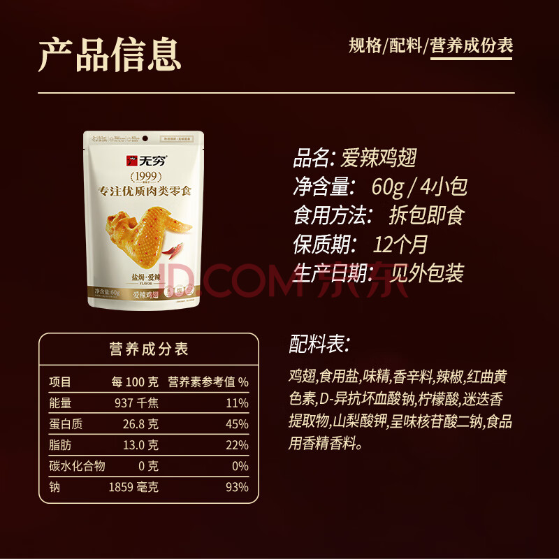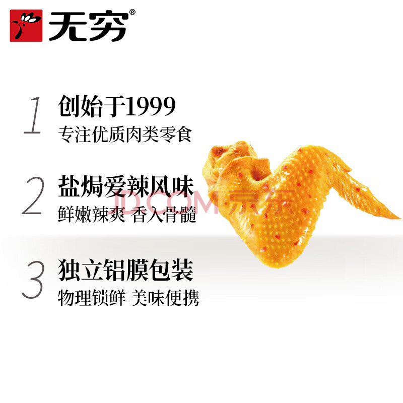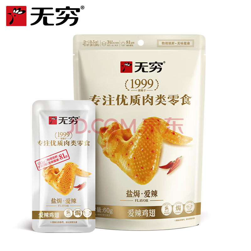 商品相册:无穷即食爱辣鸡翅休闲零食鸡翅根鸡翅中60g袋装共4小包第