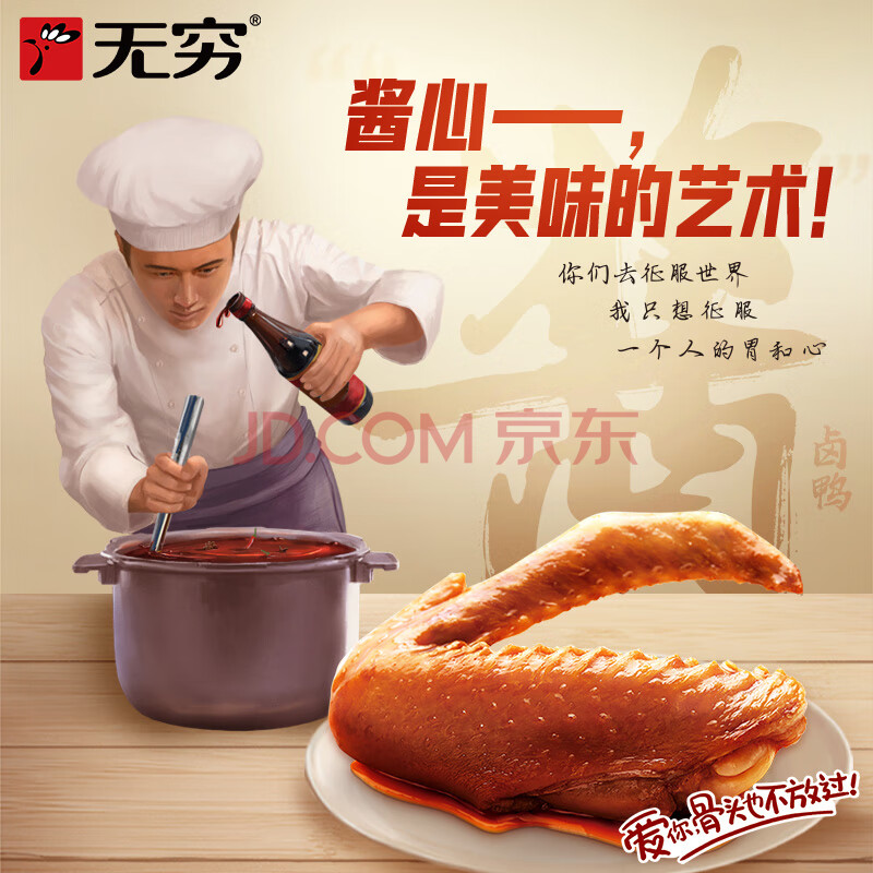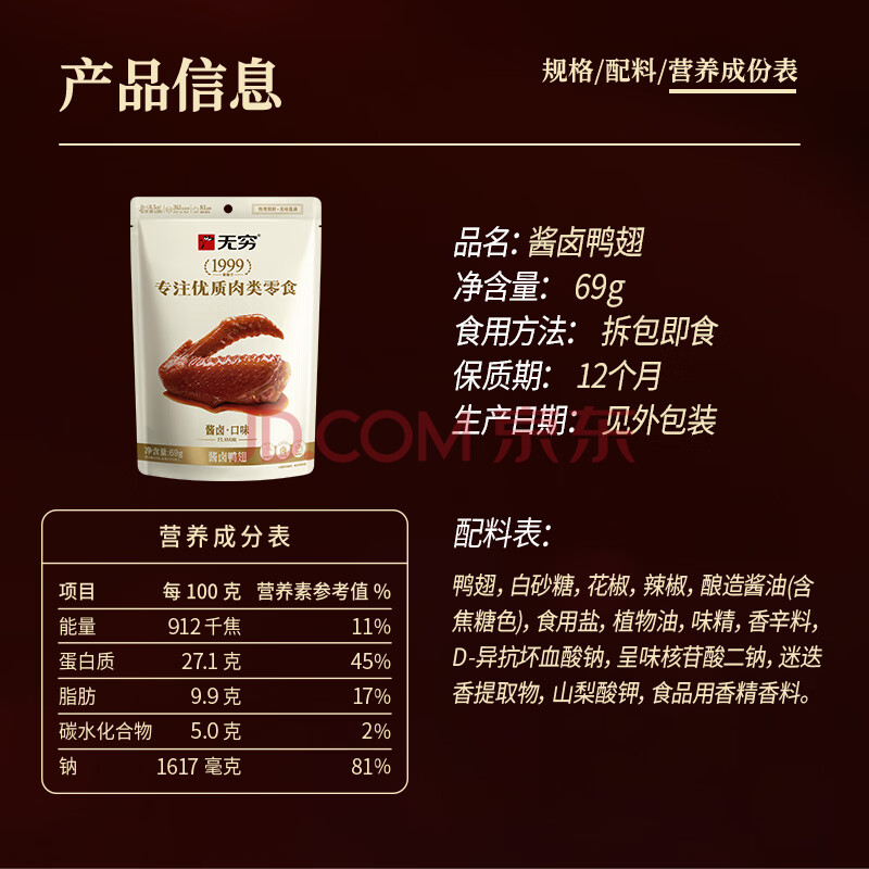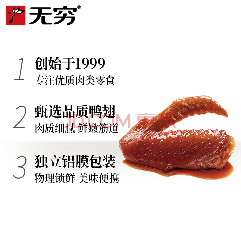 商品相册:无穷熟食即食小吃麻辣零食酱卤鸭翅69g袋装/3小包肉干肉脯第