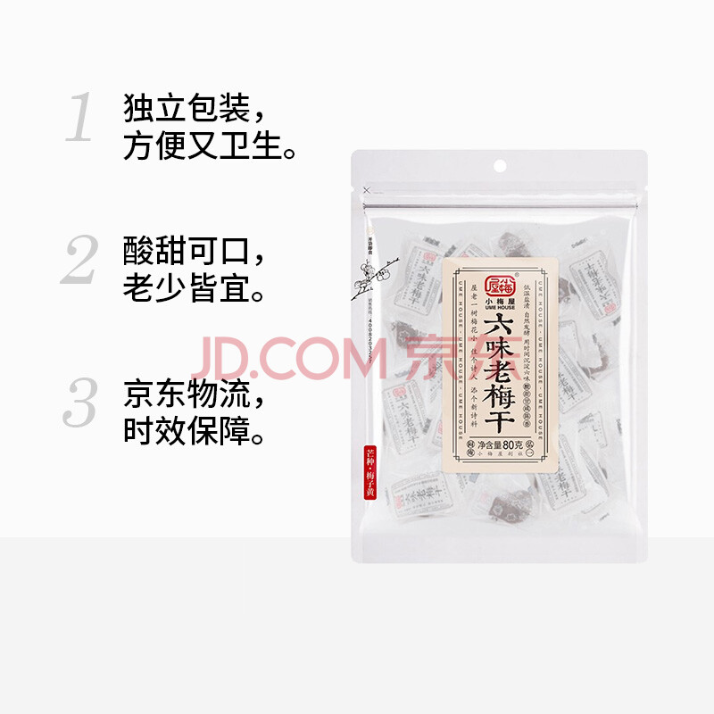 商品相册:小梅屋 六味老梅干 80g 话梅干休闲零食 办公室解馋小零食 蜜饯酸梅果脯第1张/共5