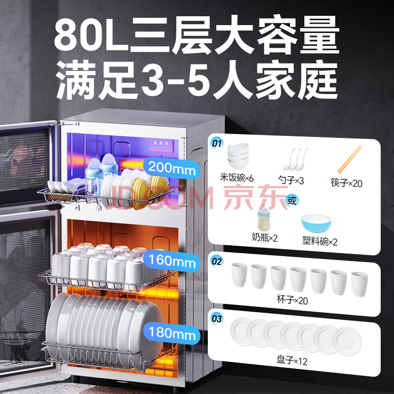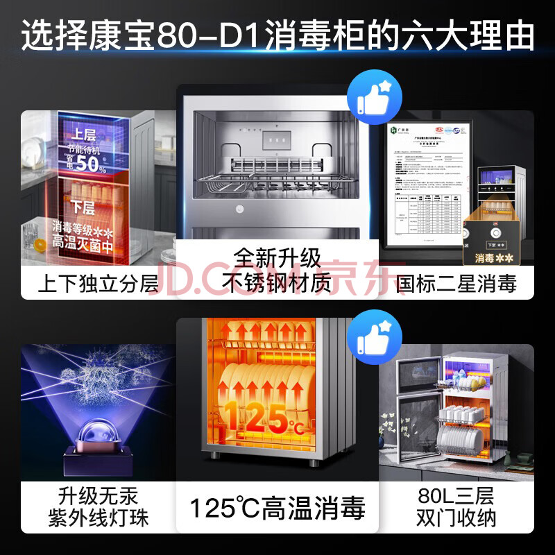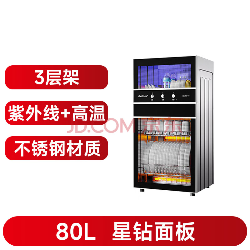 商品相册:康宝(Canbo)消毒柜家用不锈钢小型立式二星高温餐具奶瓶双门80L三层收纳消毒碗柜XDZ80-D1第