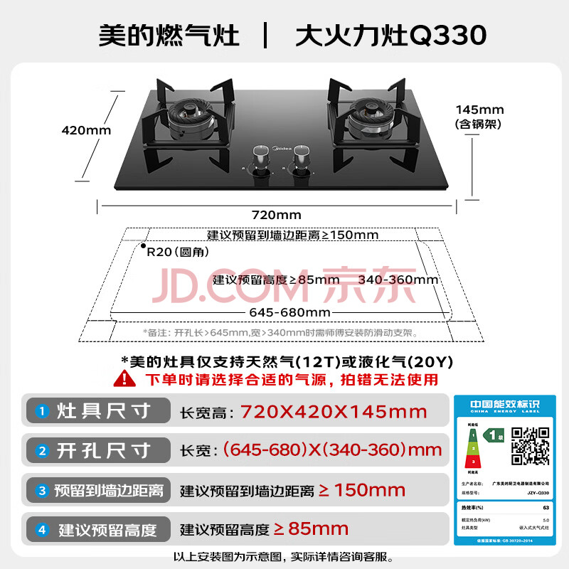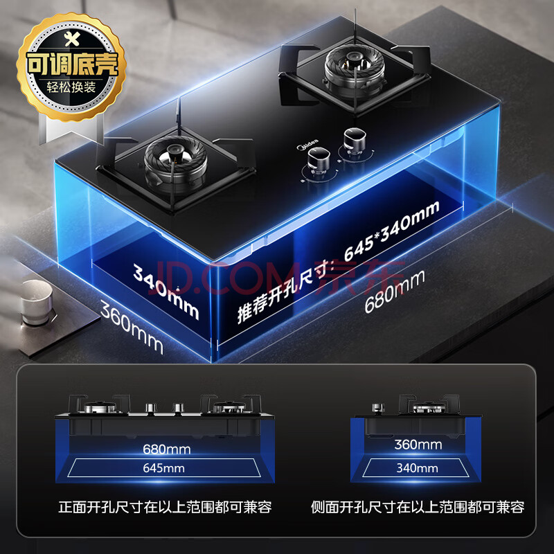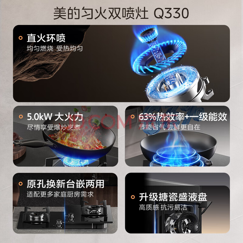 商品相册:美的(Midea)【液化气/煤气罐】燃气灶双灶家用5.0KW大火力黑晶宽面板台嵌两用双灶Q330第