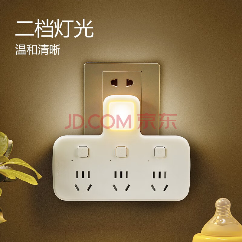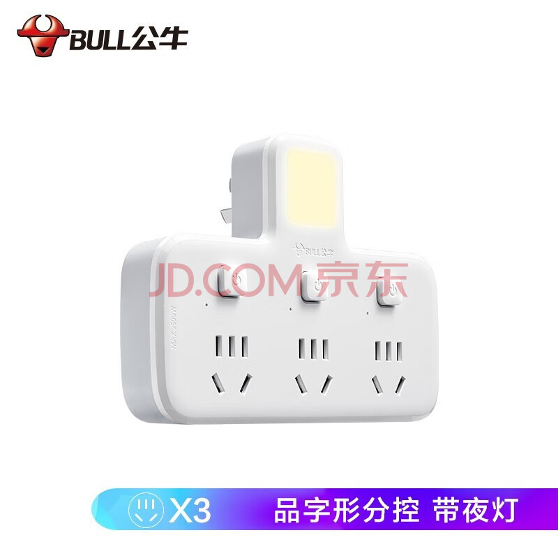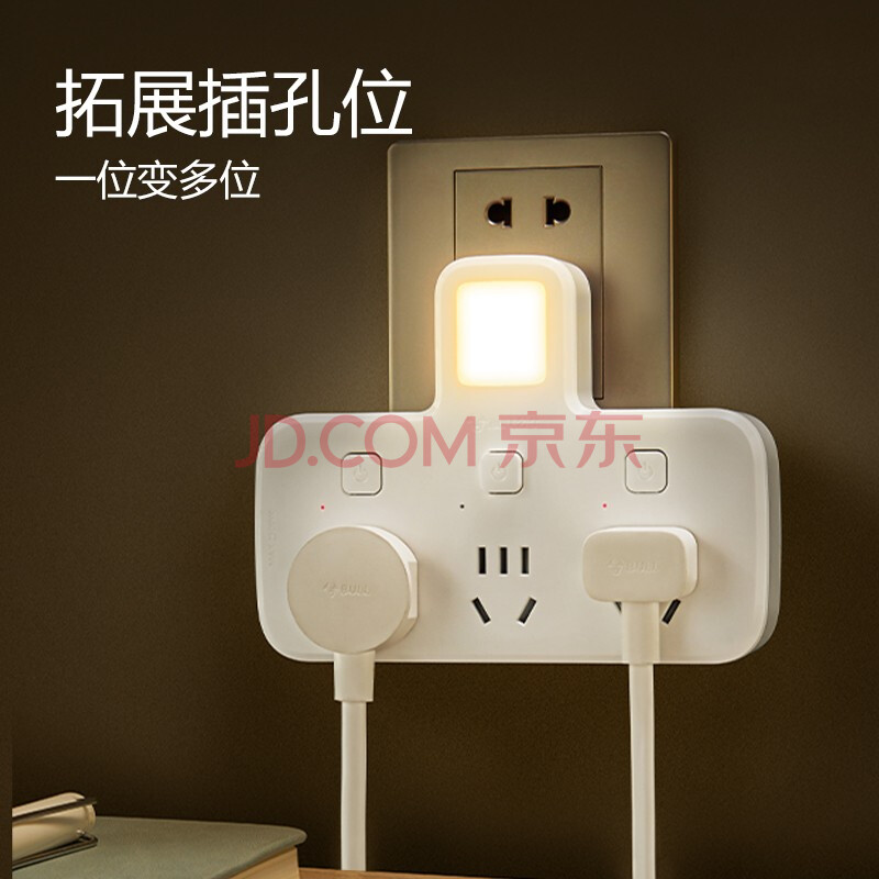 商品相册:公牛(BULL)插座扩展器一转多/一转三插座/转换插头/转换器/插排 3位分控带夜灯 GN-96033Y第1张/共5