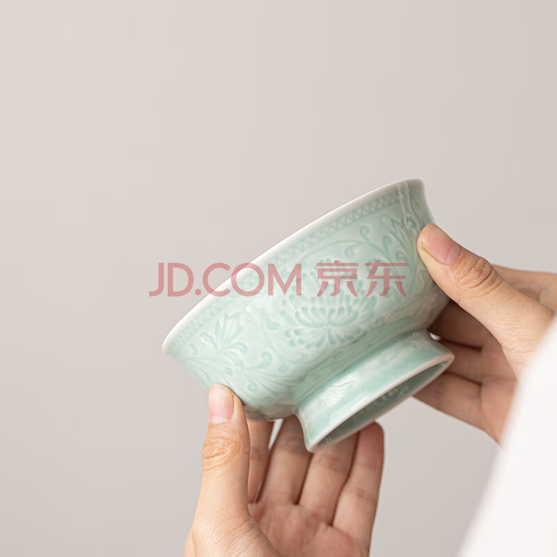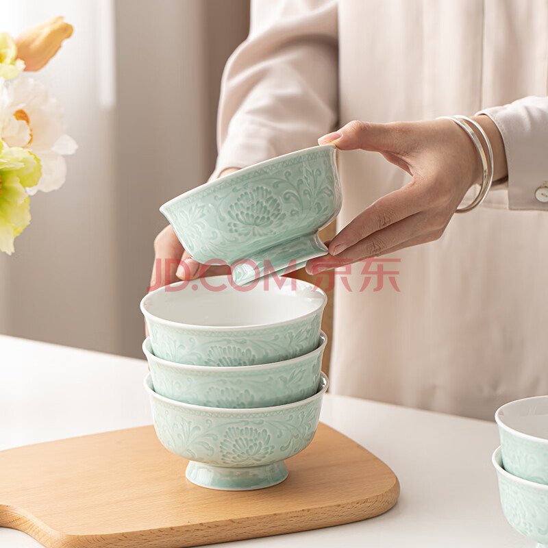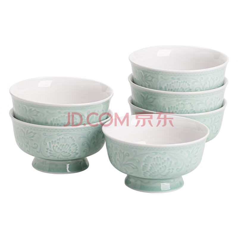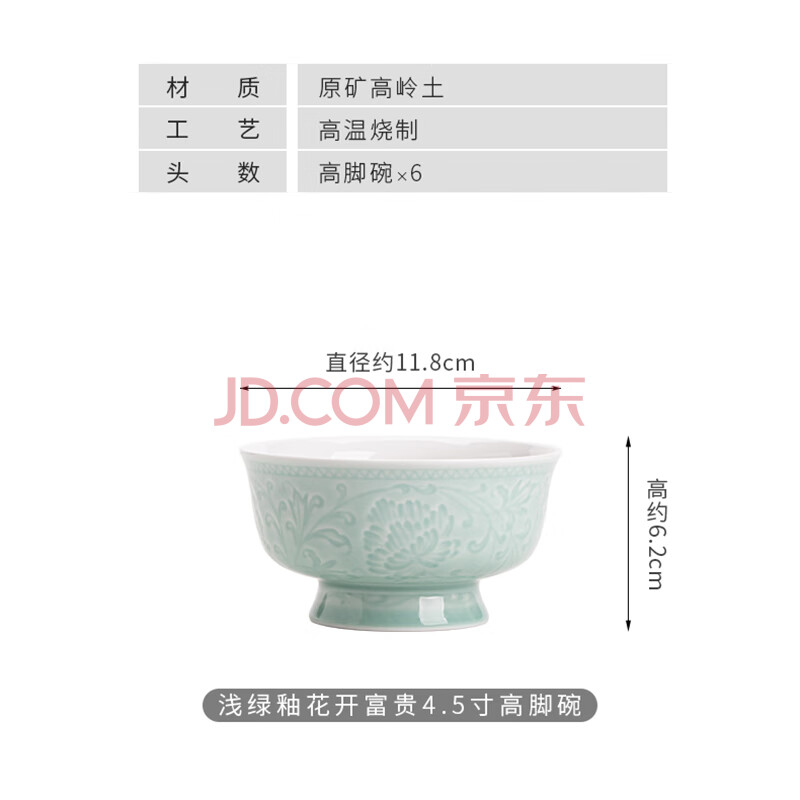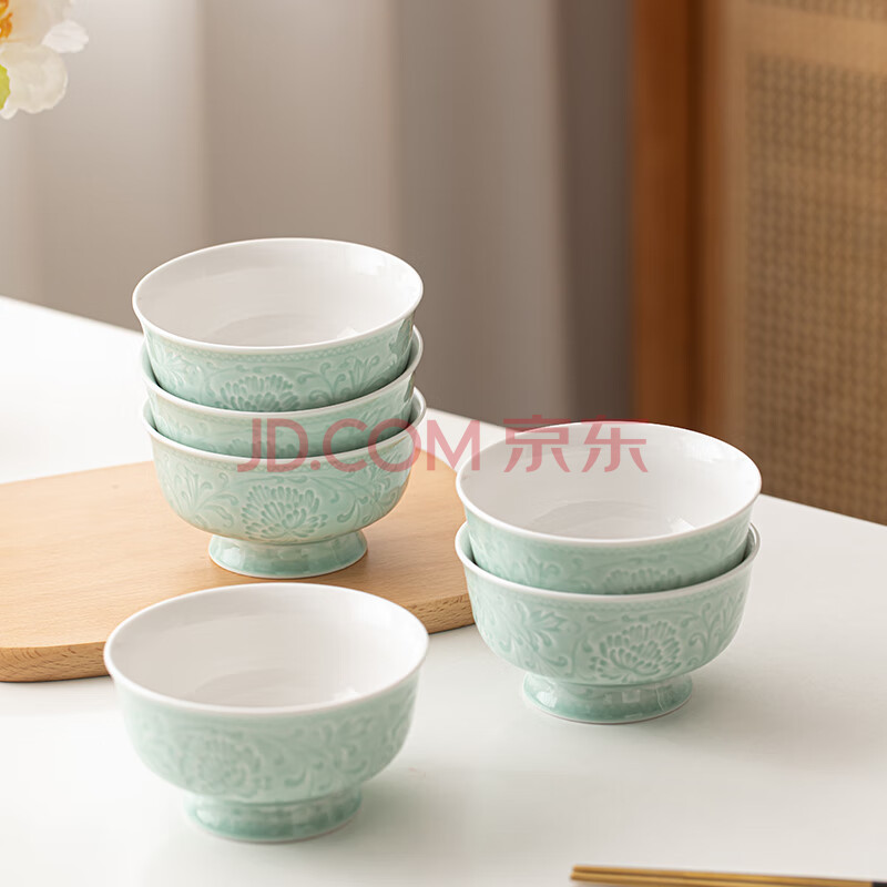 商品相册:苏氏陶瓷青瓷花开富贵高脚米饭汤碗4.5英寸六个装第