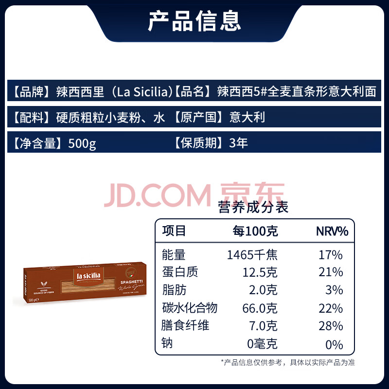 商品相册:lasicilia意大利进口全麦意面500g 直条意面意粉通心粉速食健身轻食拌面第