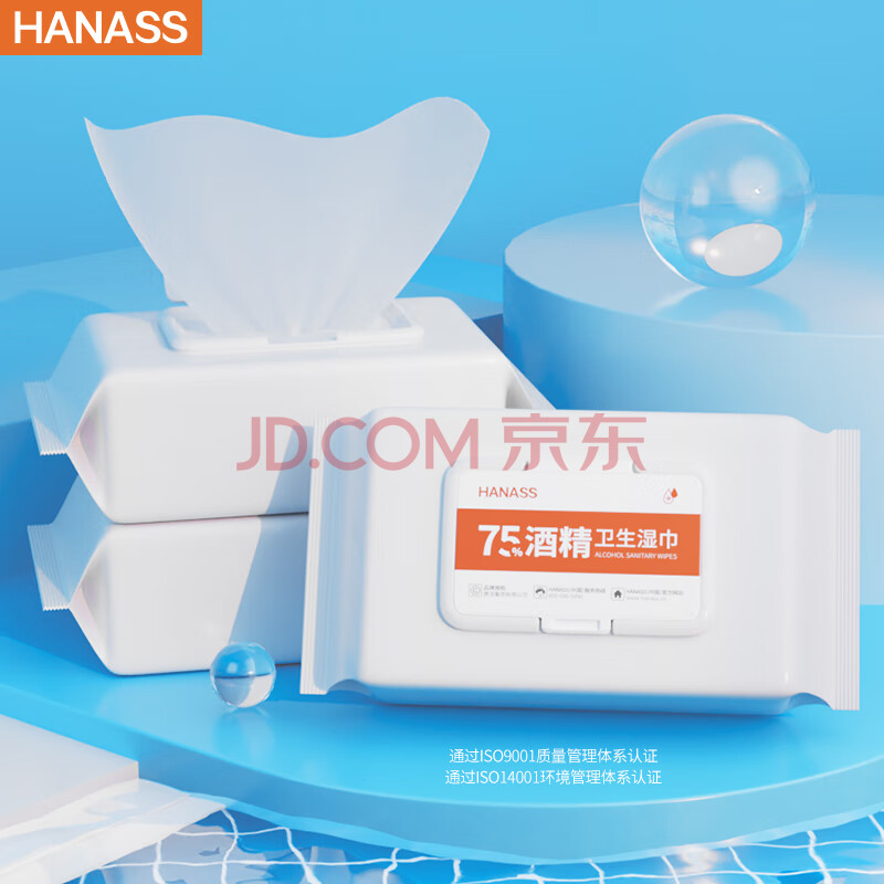 商品相册:HANASS75%酒精湿巾50抽3包卫生清洁湿巾一次性湿纸巾消毒棉片日常防护第