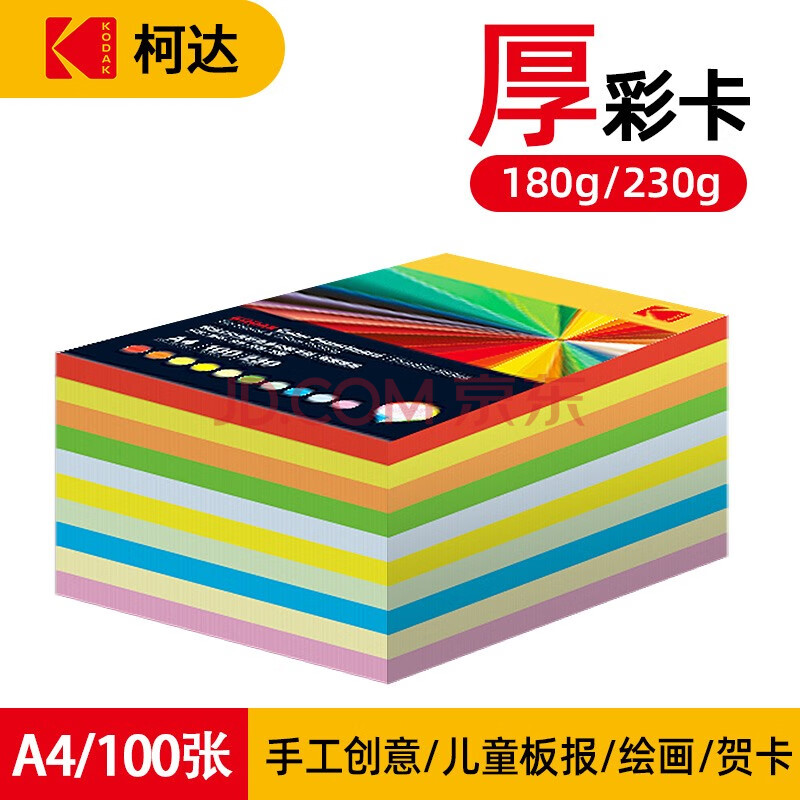 商品相册:KODAK柯达 A4彩色卡纸230克厚硬儿童手工折纸厚彩纸美术纸封面纸 十色混装100张装9891-332第