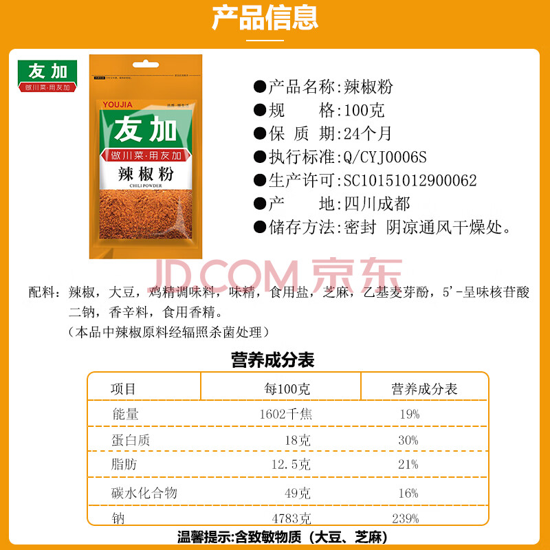 商品相册:友加食品辣椒粉100g 辣椒面火锅烧烤干碟香辣蘸料麻辣烫四川二荆条辣椒第