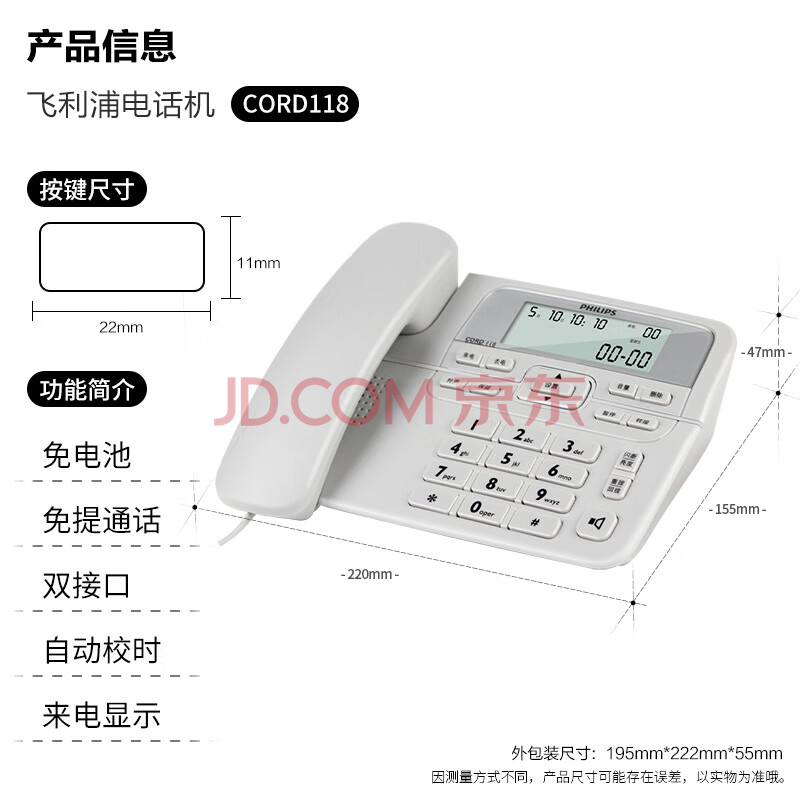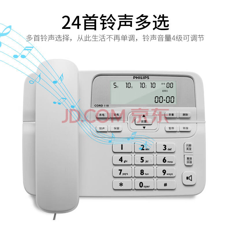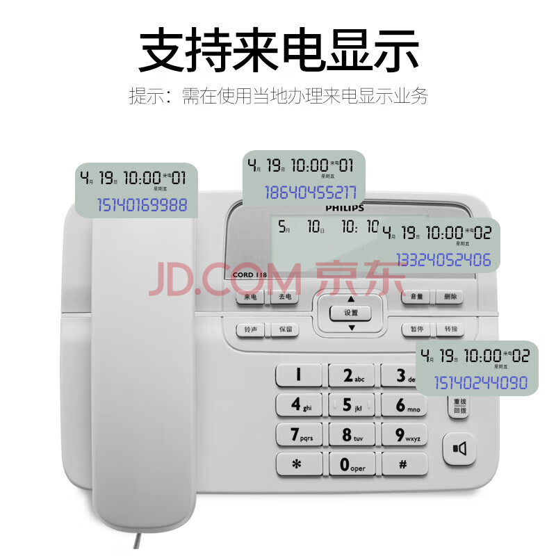 商品相册:飞利浦(PHILIPS)电话机座机 固定电话 办公家用 来电显示 双接口 免电池 CORD118灰色第