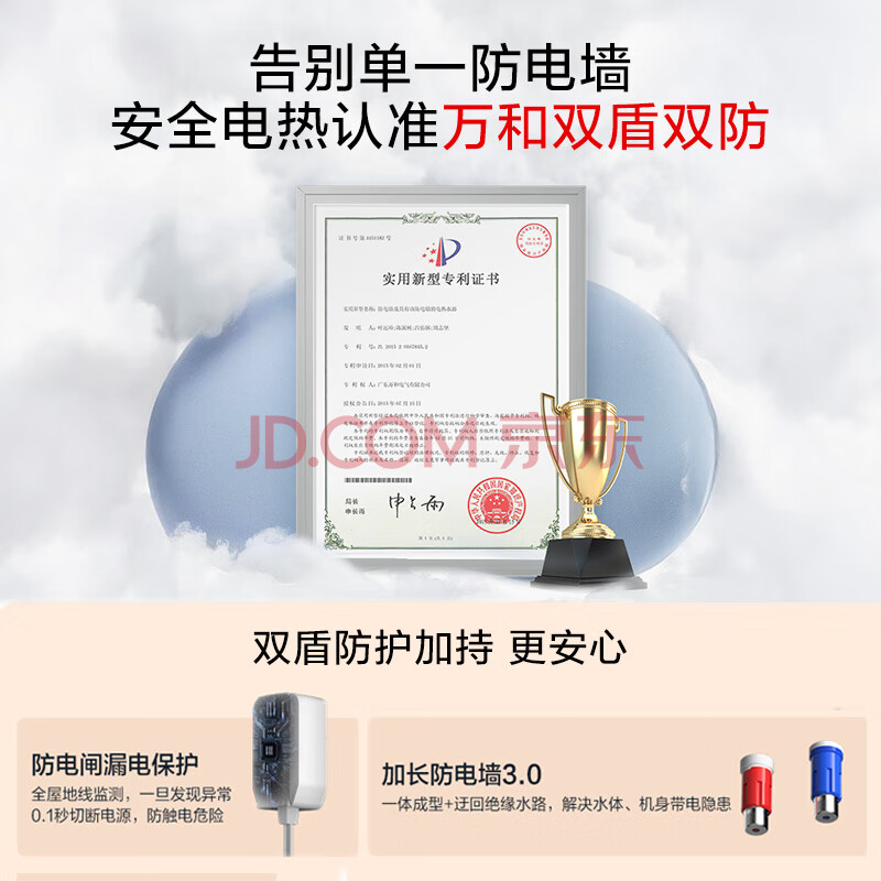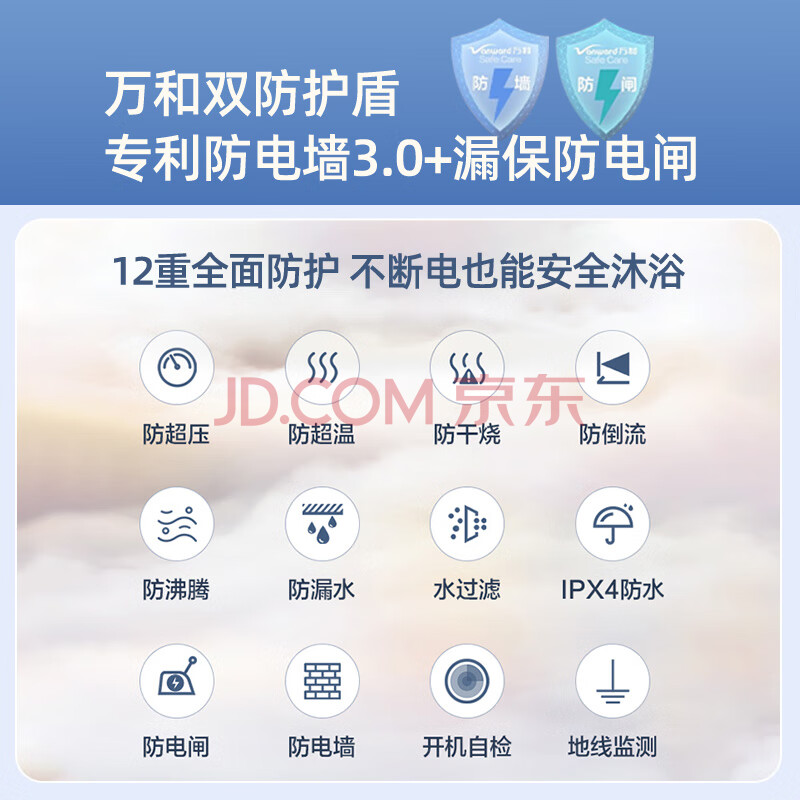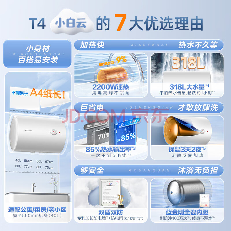商品相册:万和【小白云T4】40升2200W速热节能出租屋小型专利防电墙保护短巧易安装家用储水式电热水器第1张/共6
