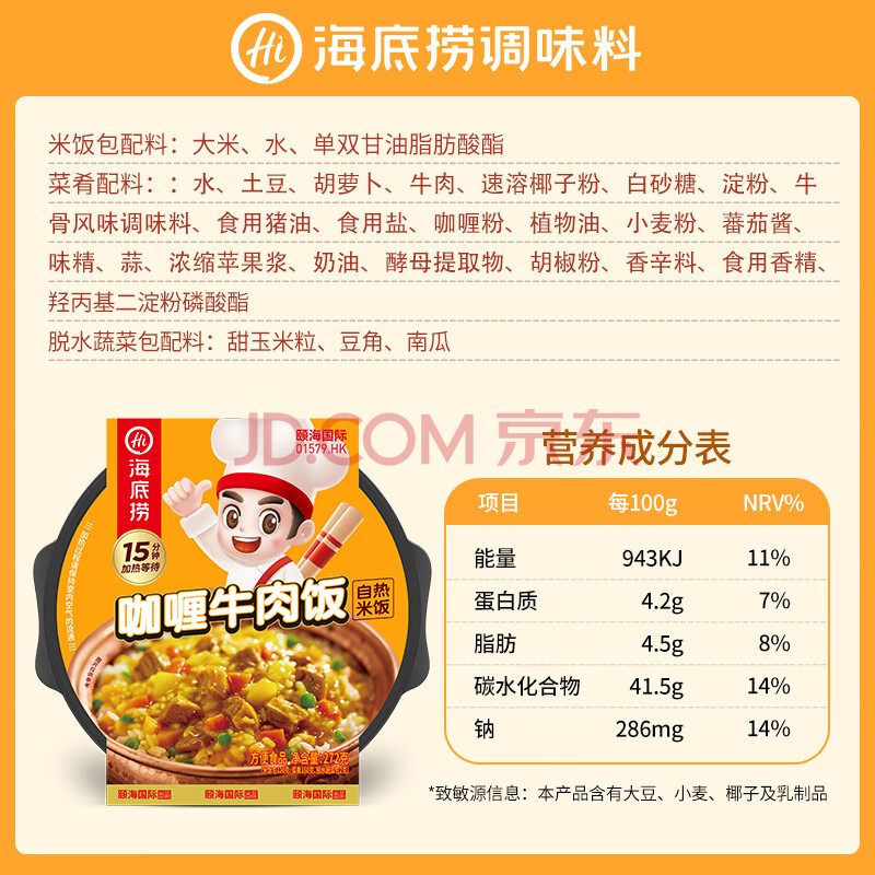 商品相册:海底捞自热米饭 方便速食加班出游便携户外米饭 咖喱牛肉味272g第