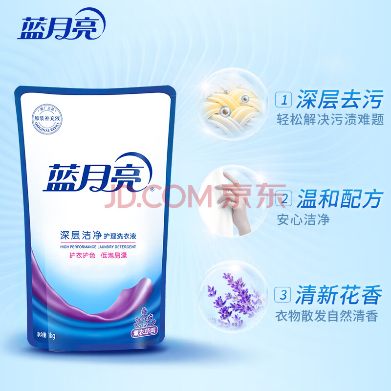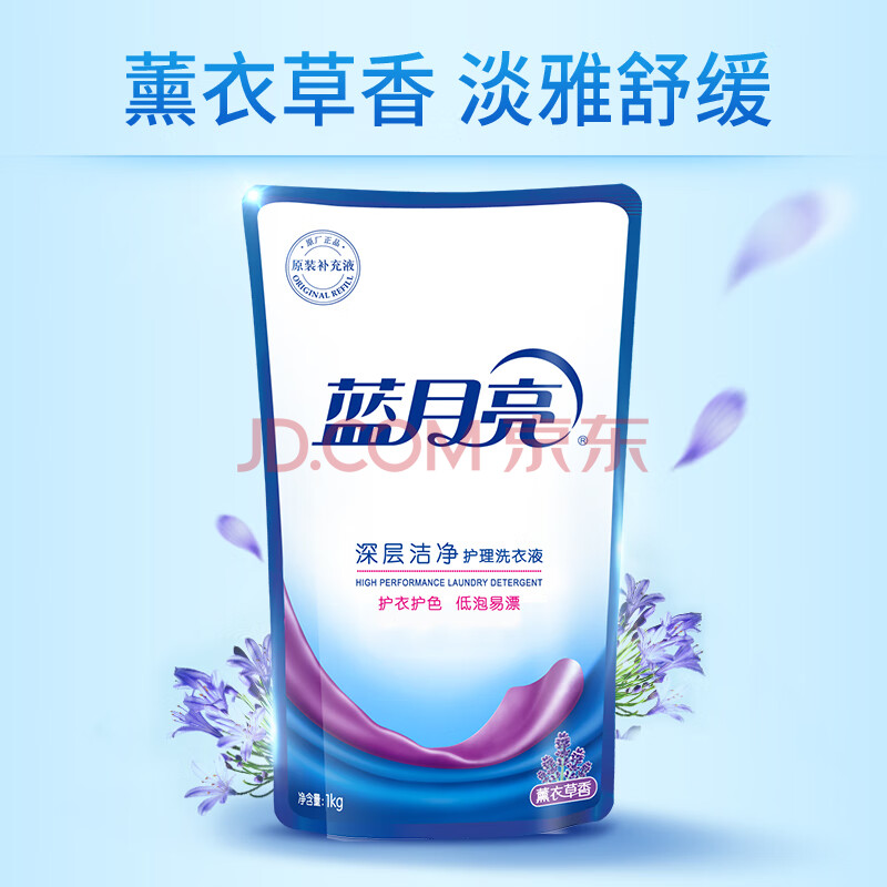 商品相册:蓝月亮 深层洁净洗衣液 薰衣草香 1kg袋装 补充装 高效除螨 强效去污第