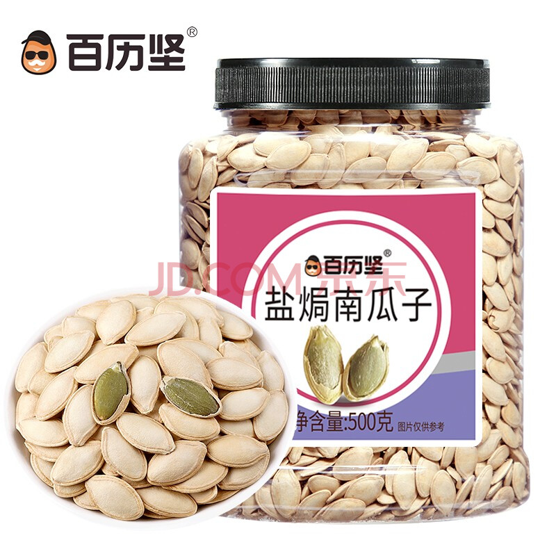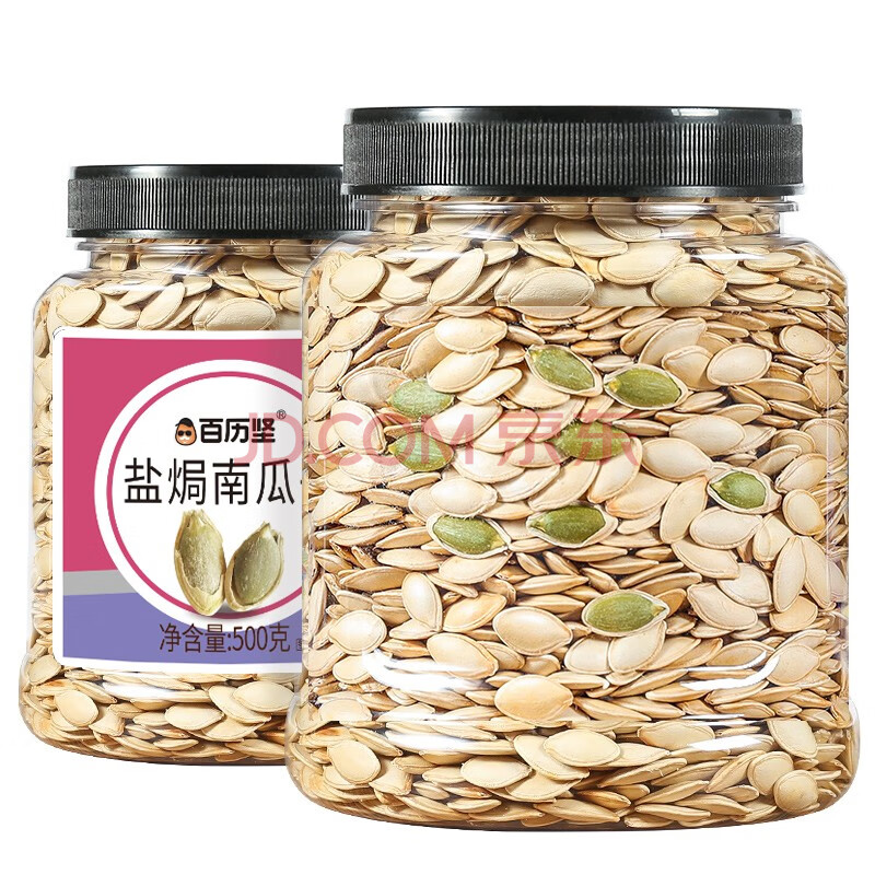 商品相册:百历坚 盐焗南瓜子500g罐装 家庭分享装炒货坚果 休闲零食 年货送礼第