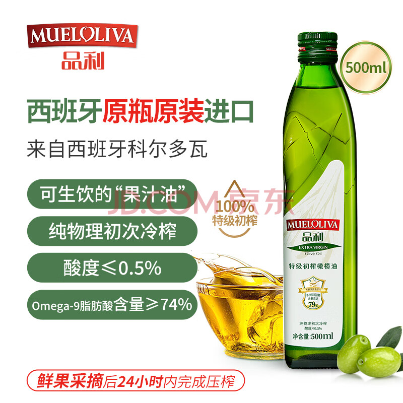商品相册:品利(MUELOLIVA)【保真橄榄油】特级初榨橄榄油500ml食用油西班牙进口辅食油送礼第1张/共8