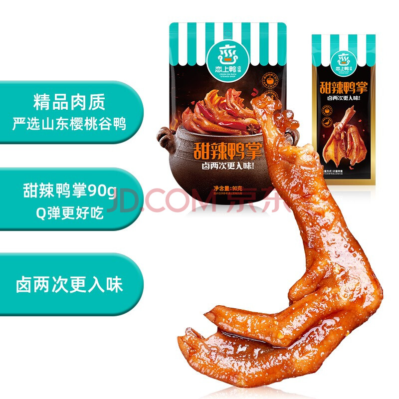 商品相册:恋上鸭卤铺 即食鸭爪鸭掌零食鸭肉熟食卤味聚会送朋友甜辣鸭掌90g/袋第1张/共3