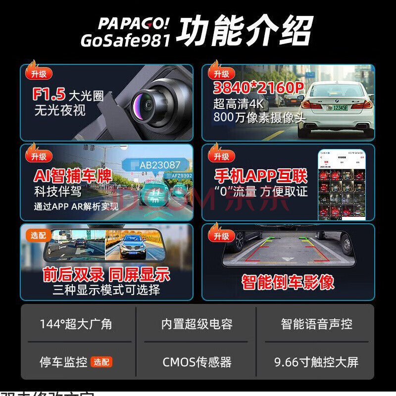 商品相册:PAPAGO!行车记录仪4K超清GoSafe981无光夜视流媒体后视镜F1.5大光圈第