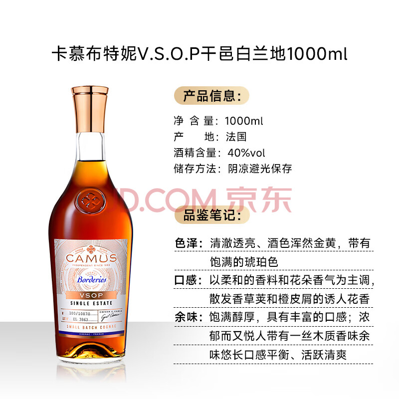 商品相册:卡慕(CAMUS)经典布特妮VSOP 干邑白兰地洋酒 1000ml 单一庄园 法国进口第