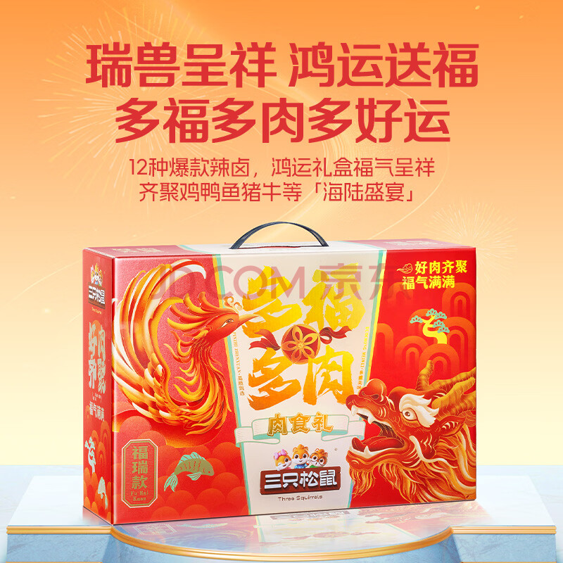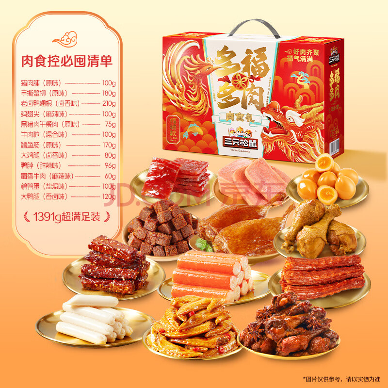 商品相册:三只松鼠多肉礼包组合1391g/12袋纯肉卤味礼盒牛肉干肉脯鸡爪零食辣卤送礼第1张/共6