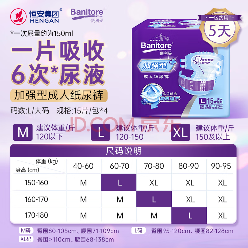 商品相册:便利妥(Banitore)加强型成人纸尿裤L码60片(臀围95-120cm)成人纸尿裤 老年人专用第