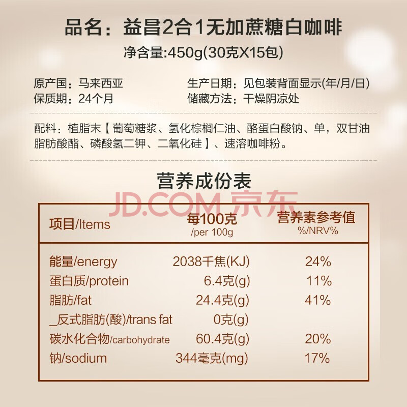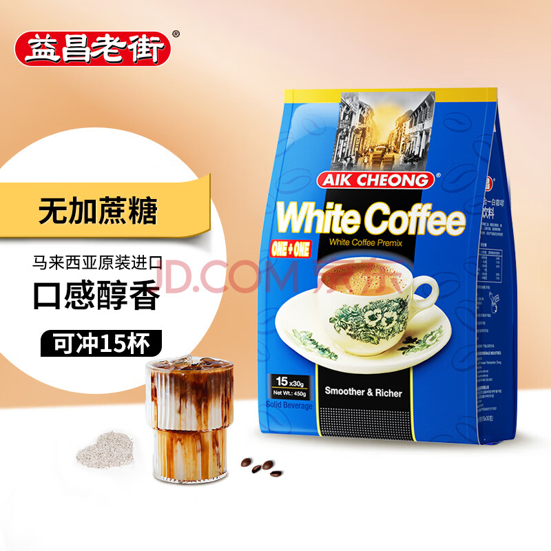 商品相册:益昌老街(AIK CHEONG OLD TOWN)2合1无加蔗糖速溶白咖啡粉 冲调饮品 马来西亚进口 15条450g第