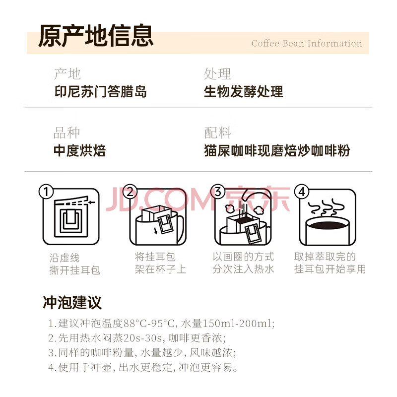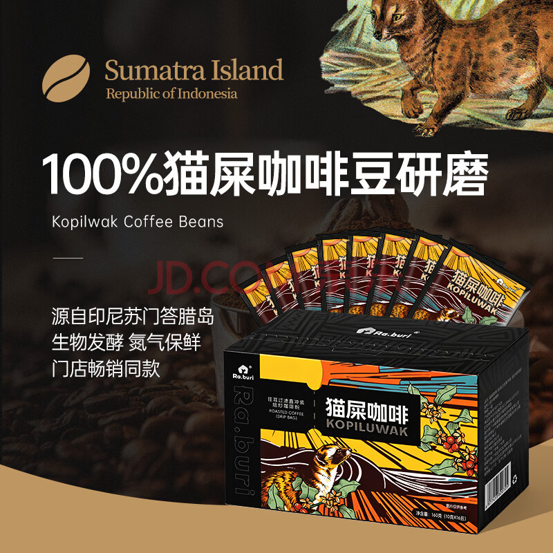 商品相册:RA.BURI正宗猫屎咖啡原料进口麝香猫精品挂耳黑咖啡手冲咖啡10g*16包/盒第
