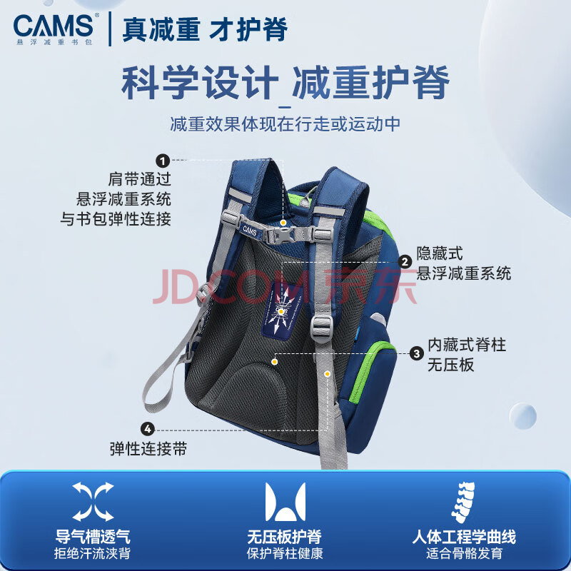 商品相册:CAMS悬浮减重书包1-3-6年级男女大容量小学生轻便护脊双肩包S03904第