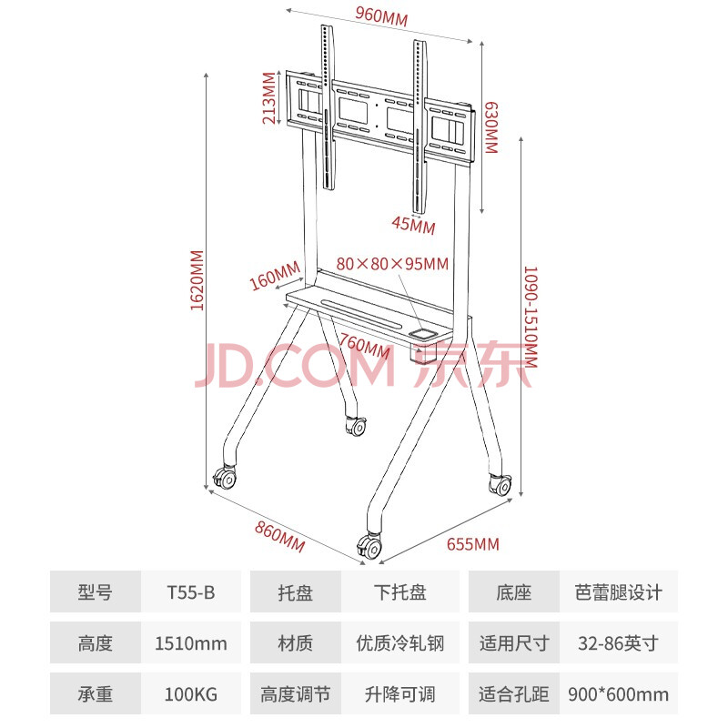 商品相册:MS移动电视支架32-86英寸视频会议电视移动推车落地电视挂架可移动小米海信创维飞利浦通用T55-B第