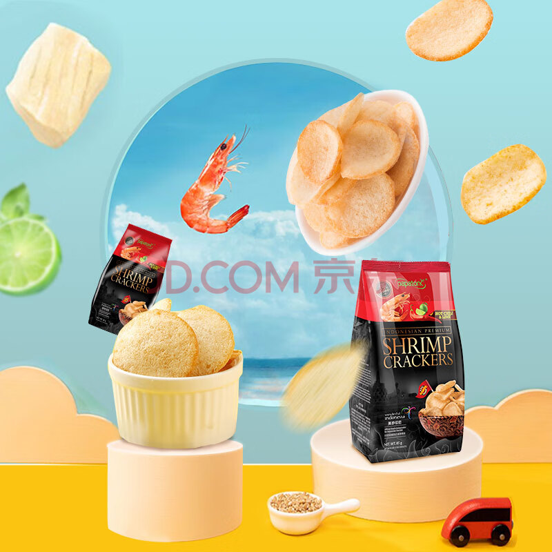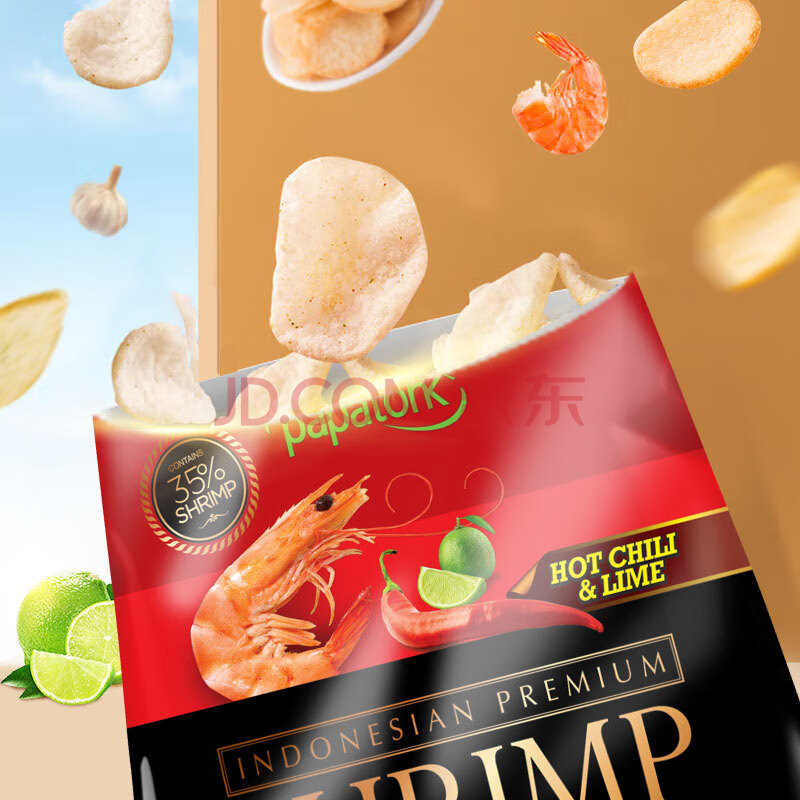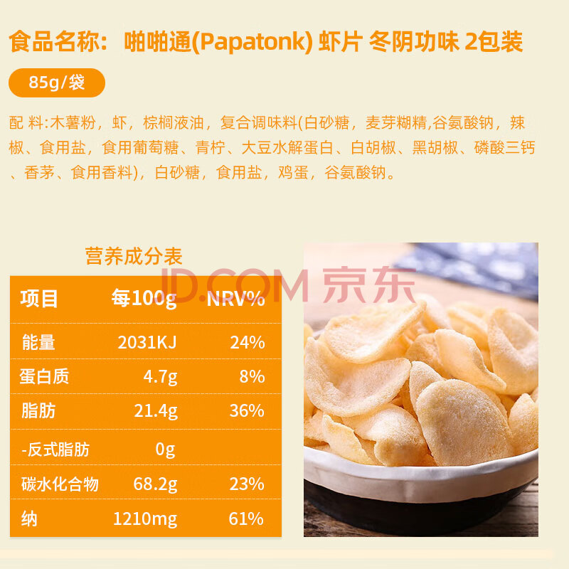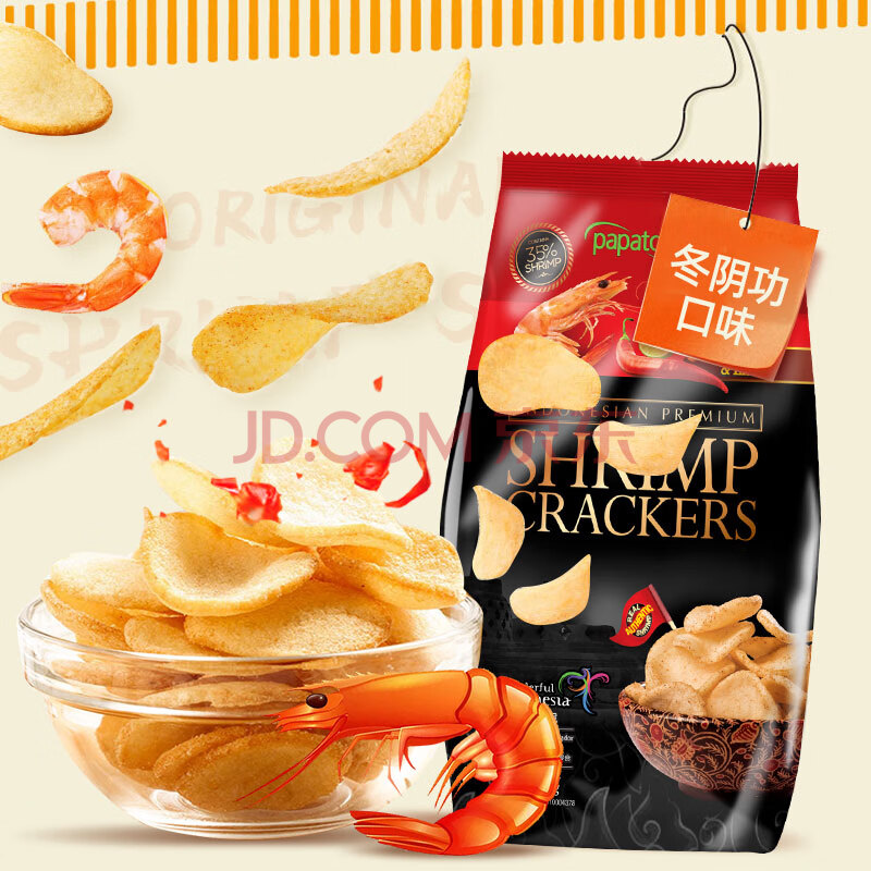 商品相册:啪啪通(Papatonk)印尼进口虾片 冬阴功味85g*2/包 薯片膨化食品 网红休闲零食小吃第