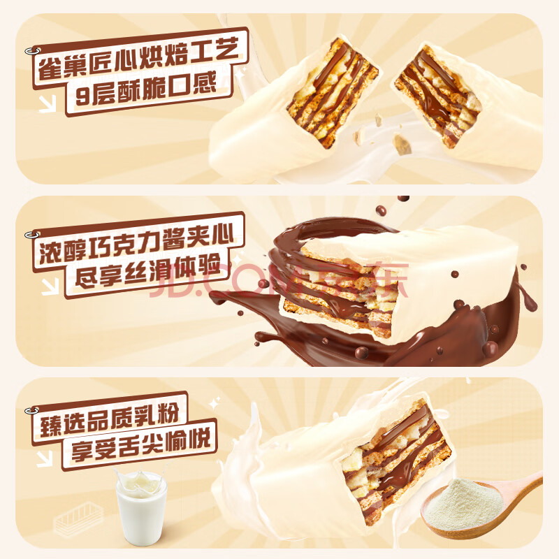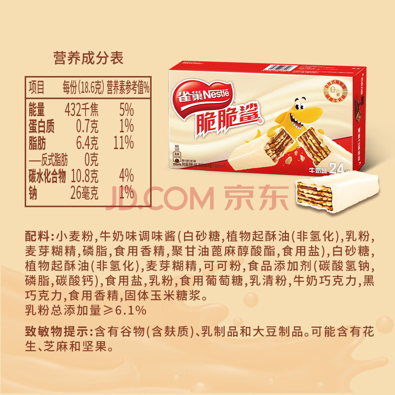 商品相册:雀巢(Nestle)脆脆鲨牛奶味巧克力夹心威化饼干24条446.4g休闲零食独立包装第