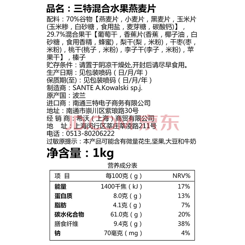 商品相册:三特sante波兰进口 混合水果燕麦片1000g/袋 快煮冲饮谷物代餐第