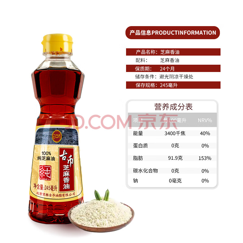商品相册:古币 芝麻香油245ml 纯芝麻油火锅蘸料油碟凉拌 京粮出品 北京老字号第1张/共8
