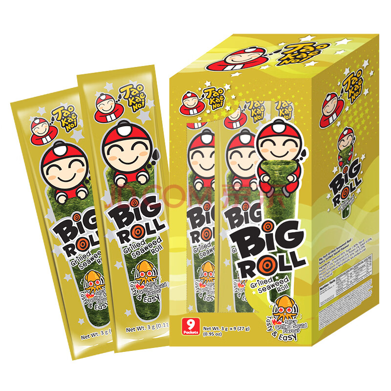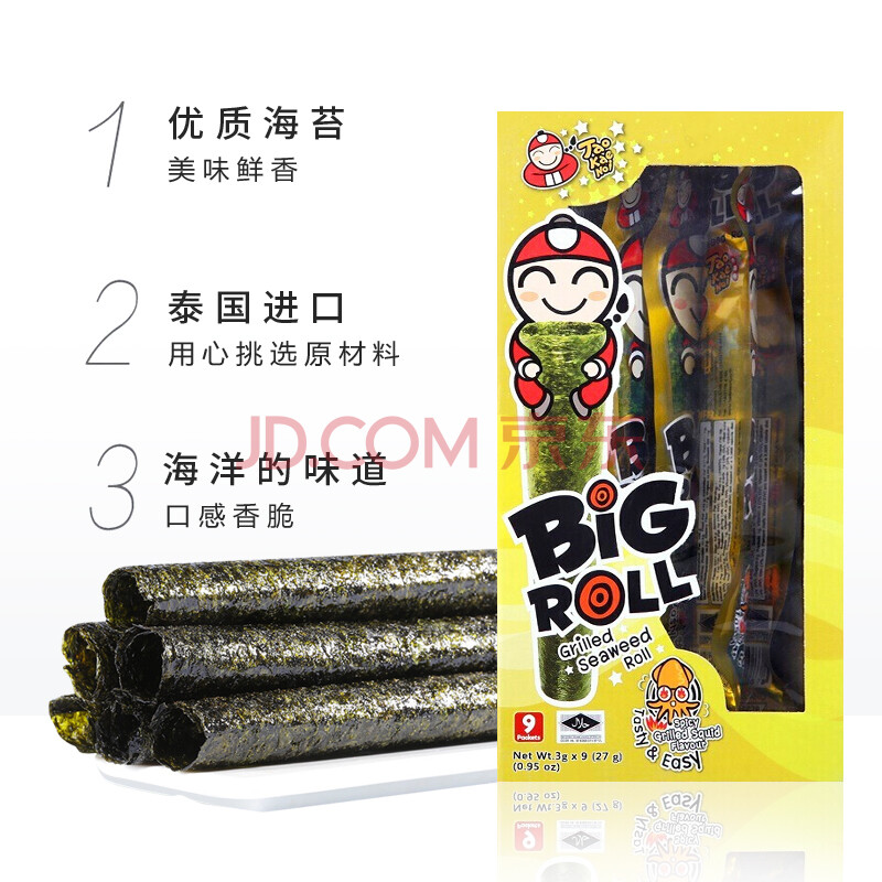 商品相册:老板仔泰国进口 海苔卷 鱿鱼味辣味 脆紫菜 休闲零食 独立包装3g*9条第