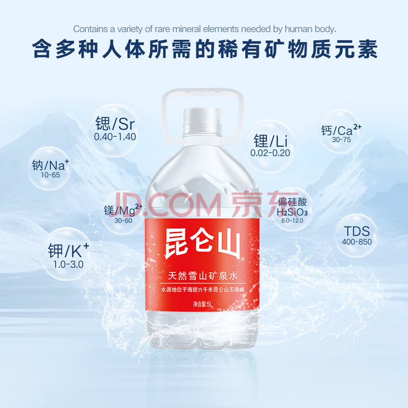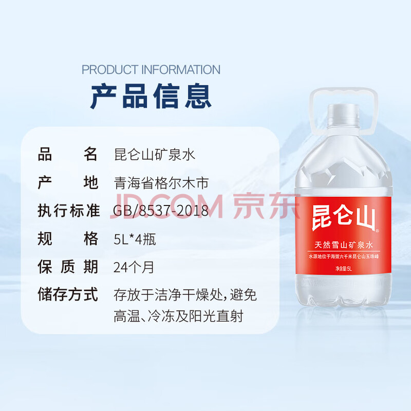 商品相册:昆仑山 大桶装矿泉水 饮用天然弱碱性 5L*4瓶 整箱装 家庭品质 第
