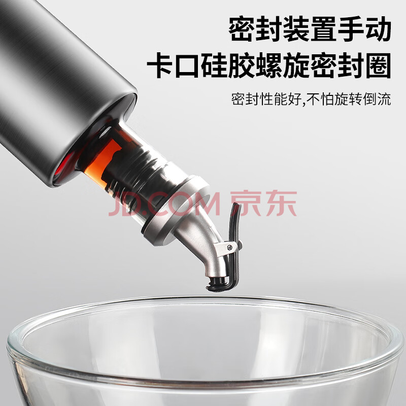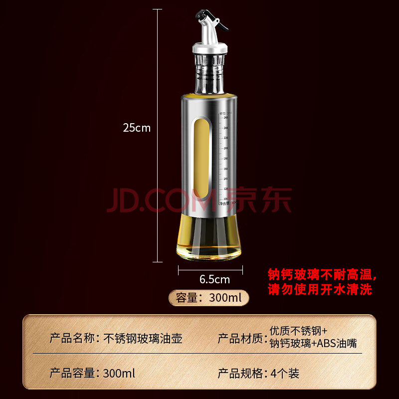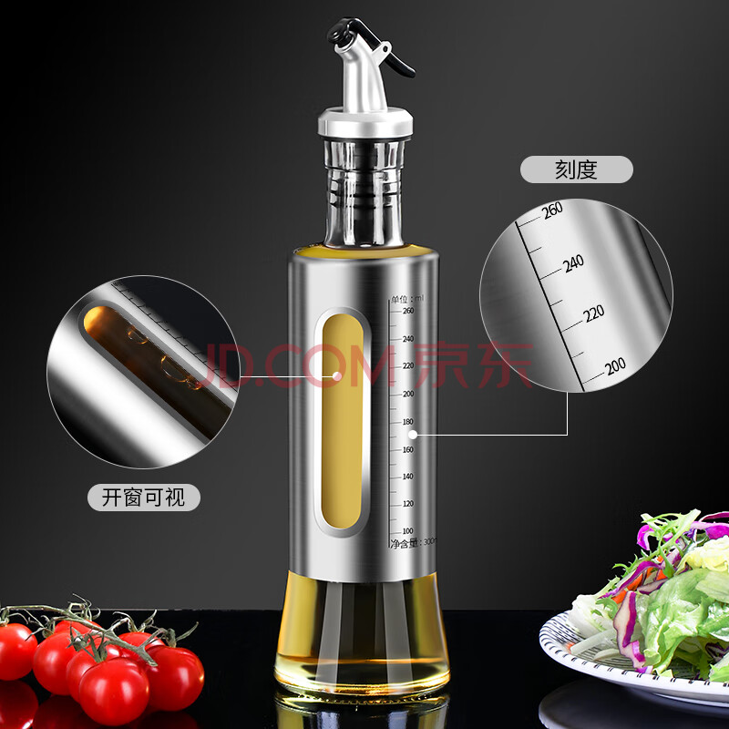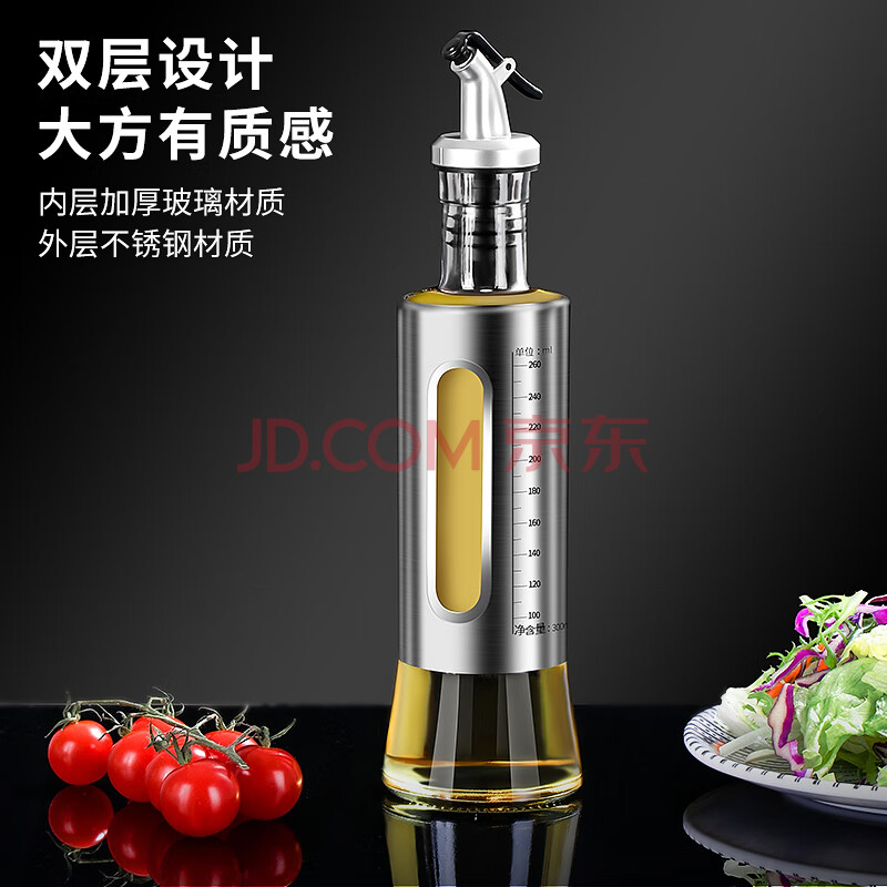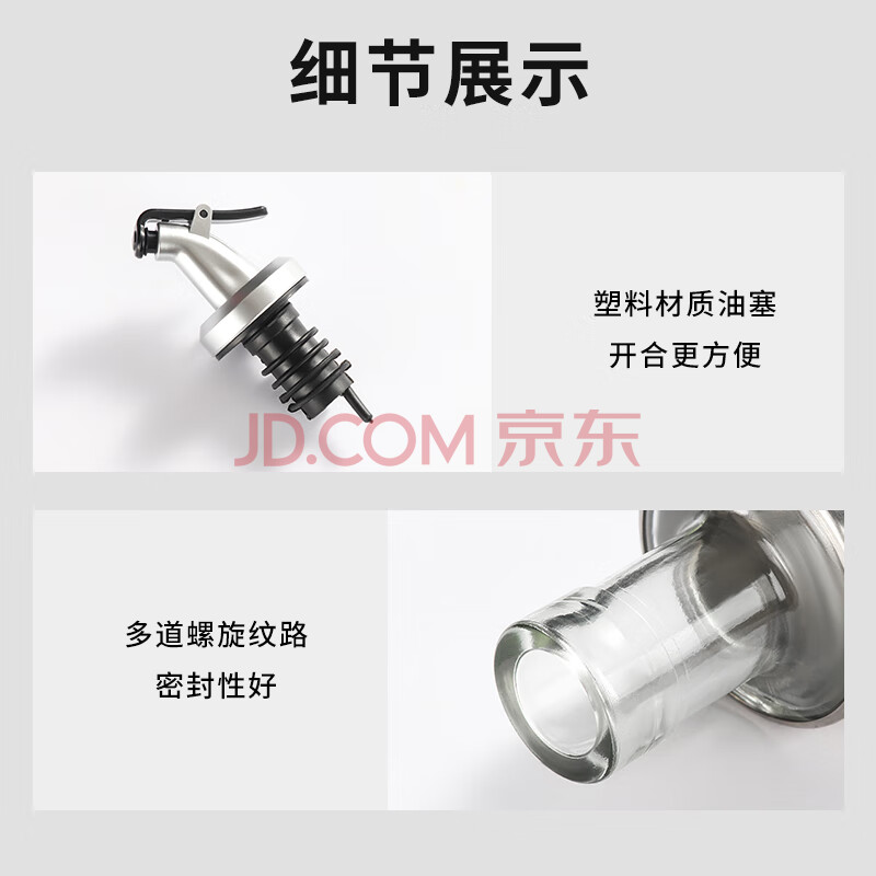 商品相册:拜杰玻璃油壶油瓶不锈钢酱油瓶醋壶倒油壶防漏嘴不挂油调料瓶300ml*4第1张/共6