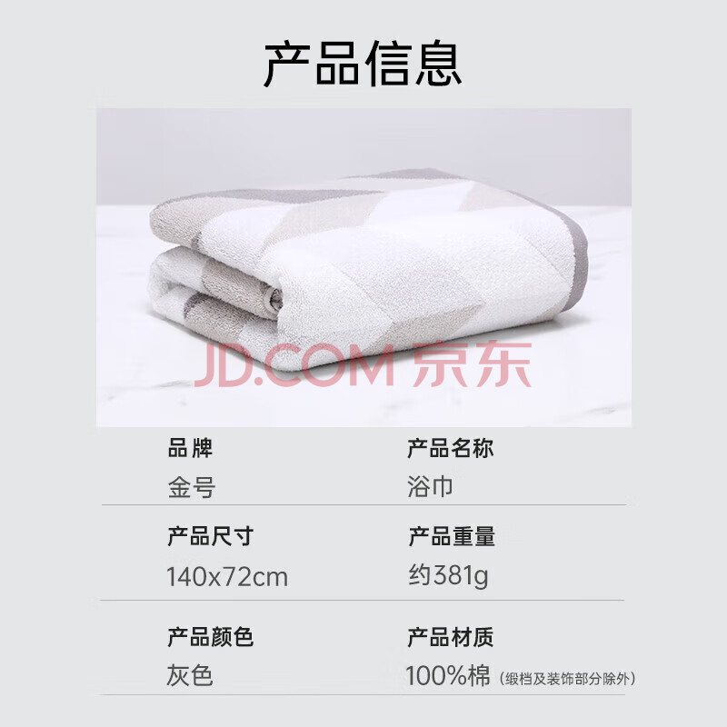 商品相册:金号五星级酒店纯棉大浴巾 加厚新疆长绒棉 灰色381g 140*72cm第