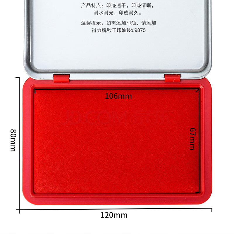 商品相册:得力(deli)【超级爆款】秒干印台120*80mm金属方形大号秒干印台印泥印油办公用品盘面106*67 红色9892第