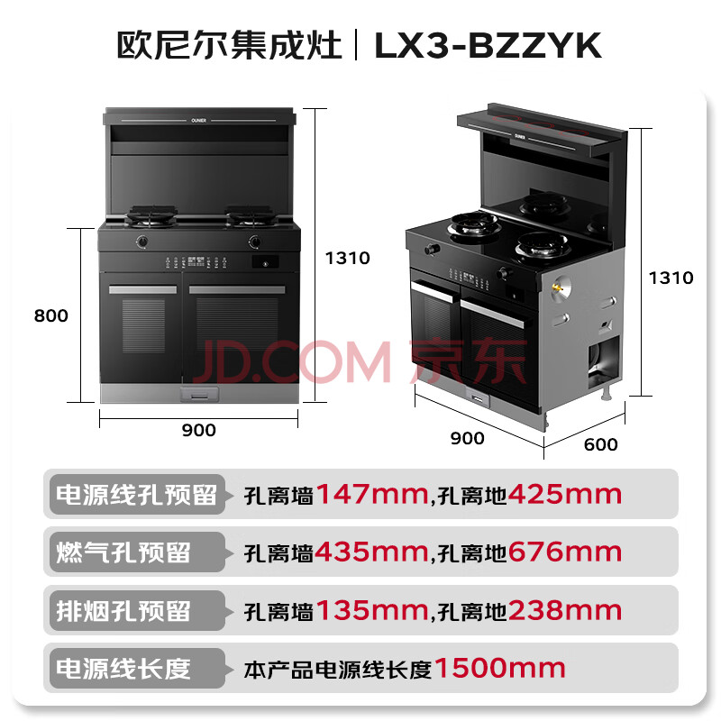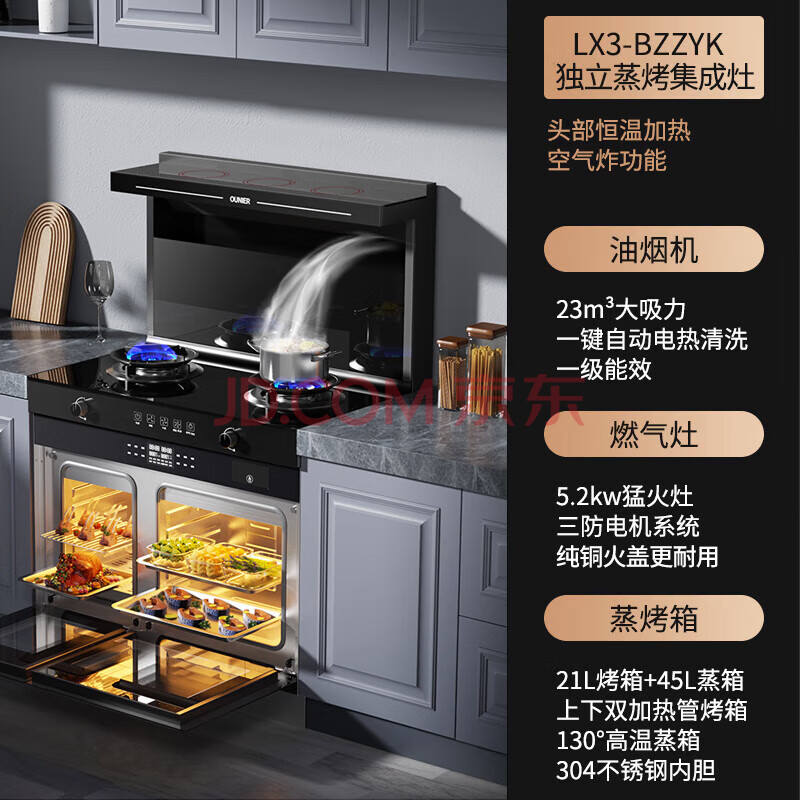 商品相册:欧尼尔厨房家用变频集成灶 蒸烤炸炖消一体式 蒸箱烤箱独立 抽油烟机 燃气灶具 LX3-BZZYK-12T第