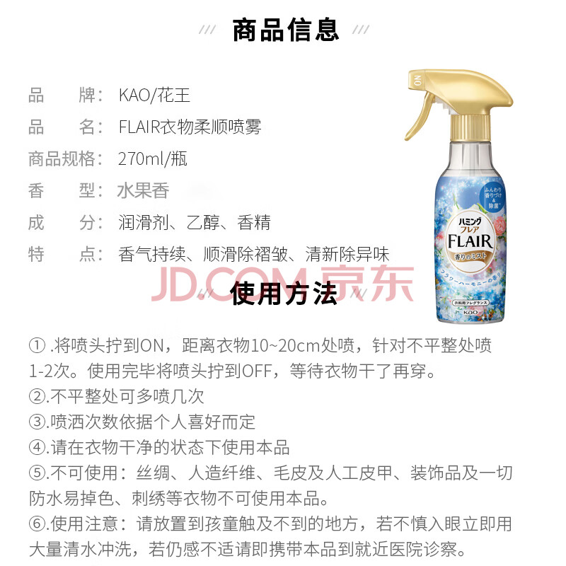 商品相册:花王(KAO)衣物香氛柔顺喷雾270ml 防静电喷雾衣服去除褶皱异味清新柔顺剂第