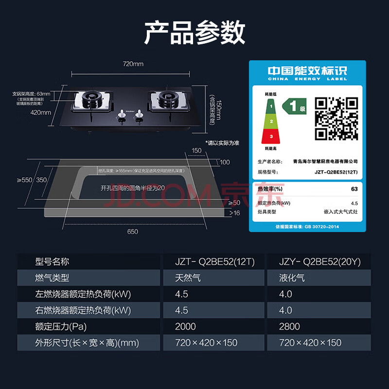 商品相册:海尔燃气灶天然气双灶聚能直喷63%热效率智能熄火保护宽频4.5KW火力台嵌两用嵌入式Q2BE52第