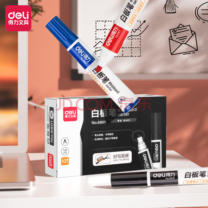 商品相册:得力(deli)办公可擦易擦白板笔 办公会议教学 黑色顺滑书写 10支/盒 办公用品 6801第1张/共5
