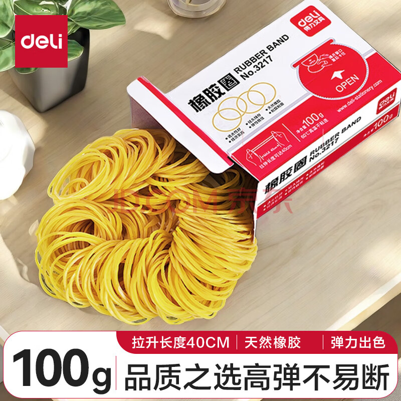 商品相册:得力(deli)100g耐用弹力橡皮筋/橡胶圈/牛皮筋 单盒装 财务办公用品 3217第
