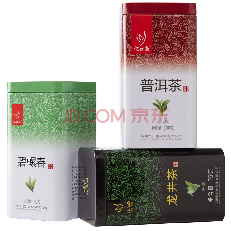 商品相册:忆江南组合茶叶雨前龙井碧螺春普洱茶275g三罐装口粮茶送礼第